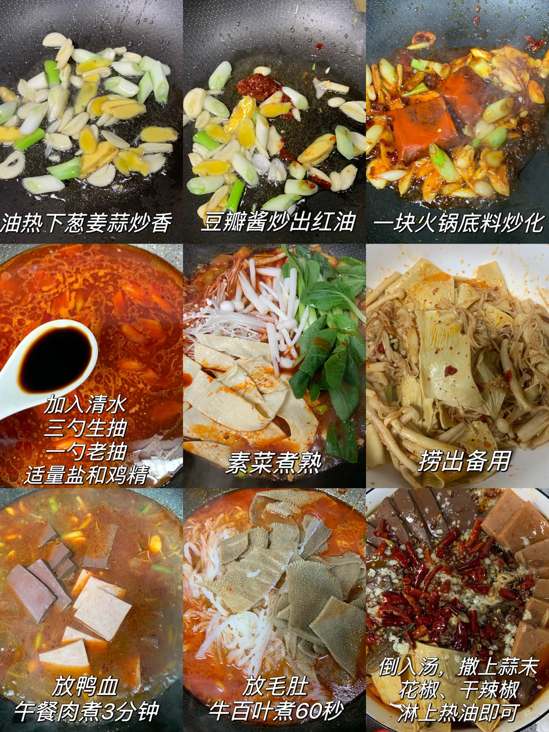 1⃣️准备好所有食材,锅内热油爆香葱姜蒜,加一勺豆瓣酱炒出红油、一块火锅底料炒化