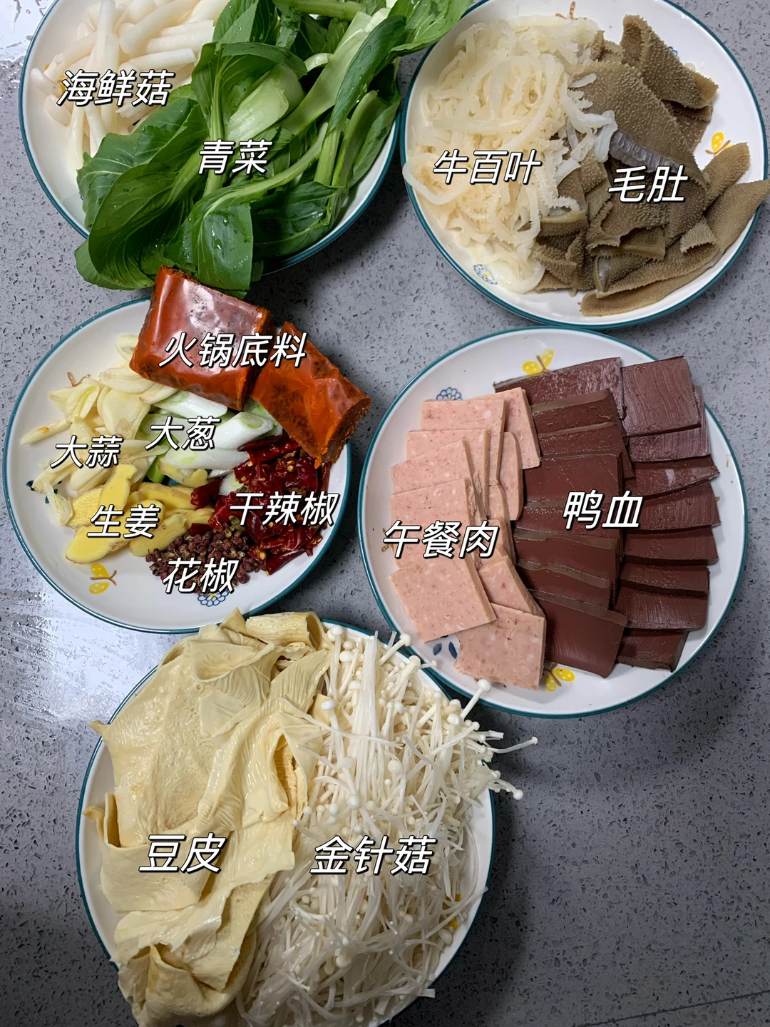食材:鸭血、午餐肉、毛肚、牛百叶、豆皮、金针菇、海鲜菇、青菜、火锅底料、花椒、姜、蒜、大葱