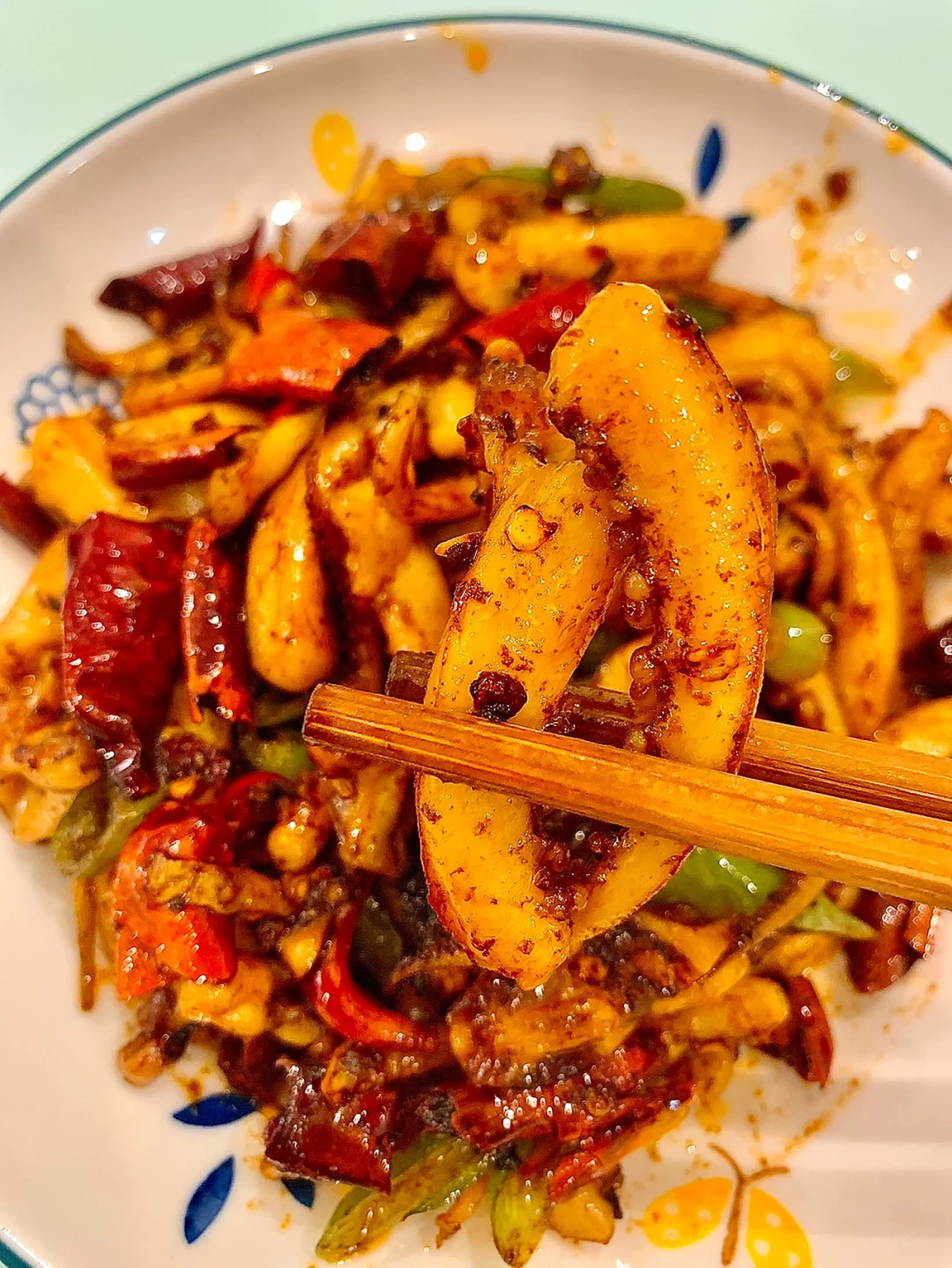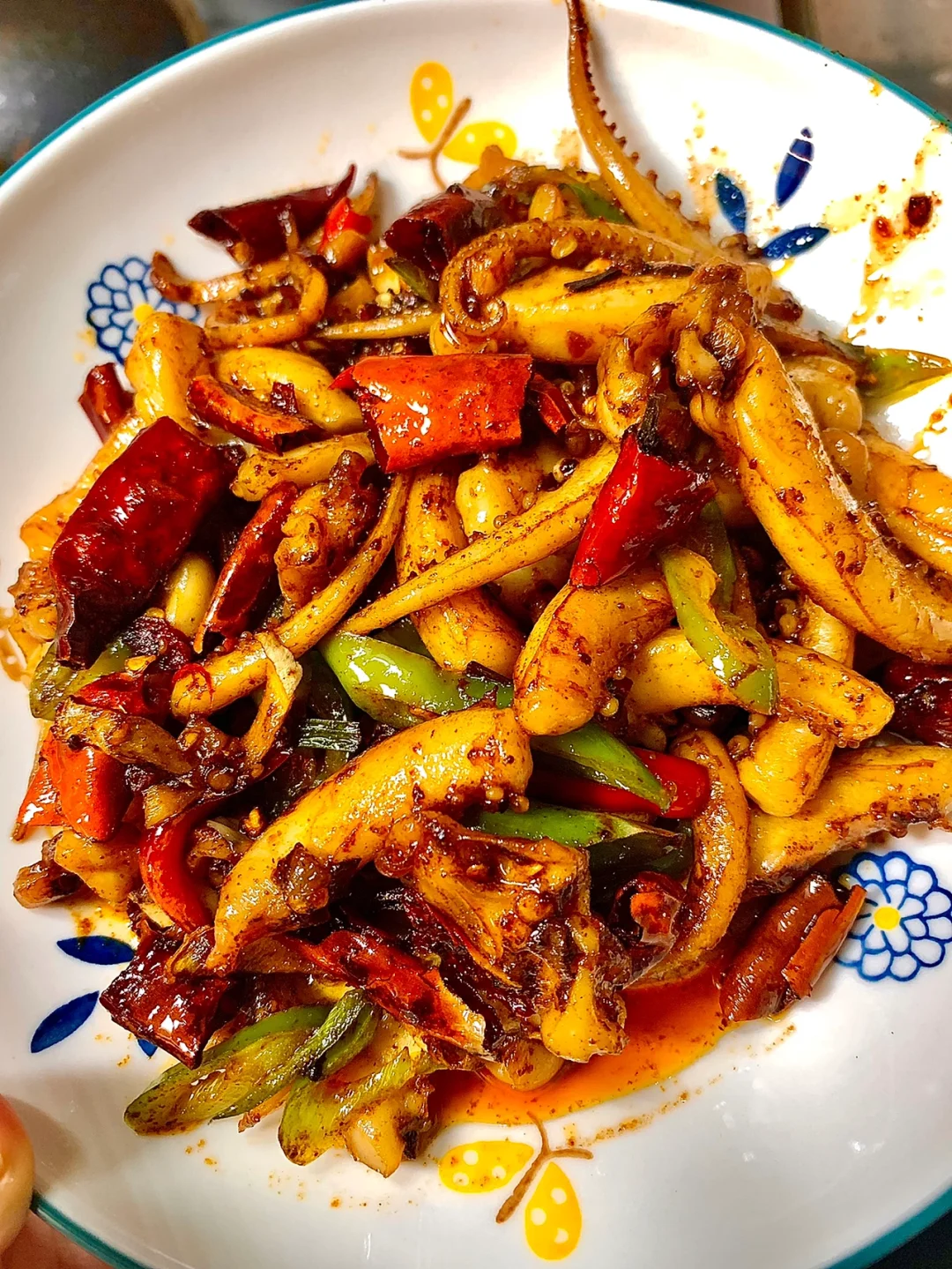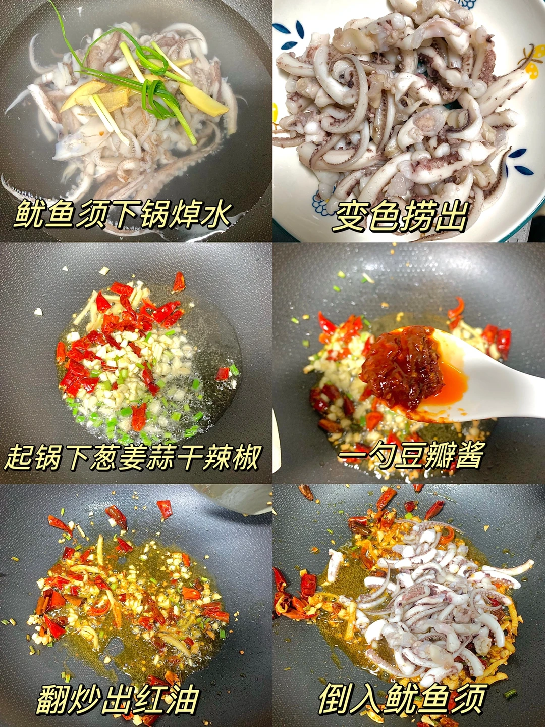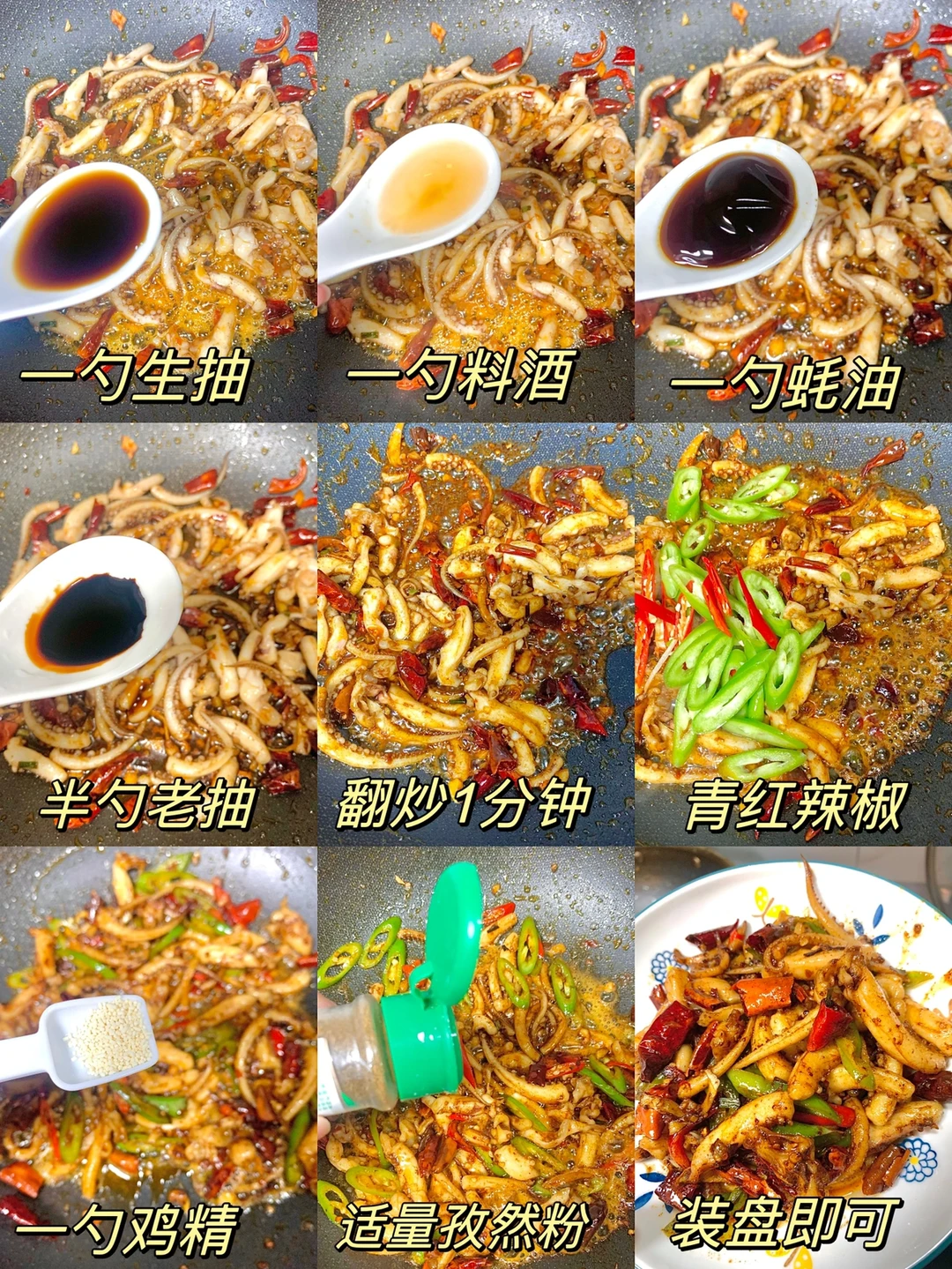 👉🏻喜欢吃鱿鱼须必不能错过的一道菜,在家十分钟就做好了!香辣过瘾,一口一个停不下来😋做法如下: 食材:鱿鱼须,二荆条,小米辣,葱花姜蒜末少许 1⃣️鱿鱼须处理好,冷水下锅,加入姜片、料酒、葱段焯水捞出 2⃣️锅内热油爆香葱姜蒜末干辣椒炒香,一勺豆瓣酱炒出红油,倒入鱿鱼须翻炒几下,加入一勺生抽、一勺蚝油、一勺料酒、半勺老抽翻炒,加入青红辣椒段炒断生,加入一勺鸡精、适量孜然粉调味即可!