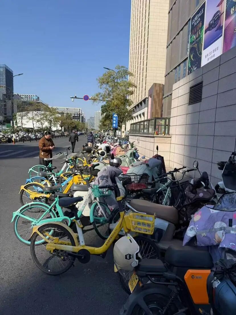今天上午九点,我们在金家渡地铁站E口的出入口处,看到了大量非机动车停放占道。
