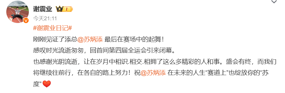 谢震业发文祝贺苏炳添:在未来人生赛道上绽放你的“苏度”