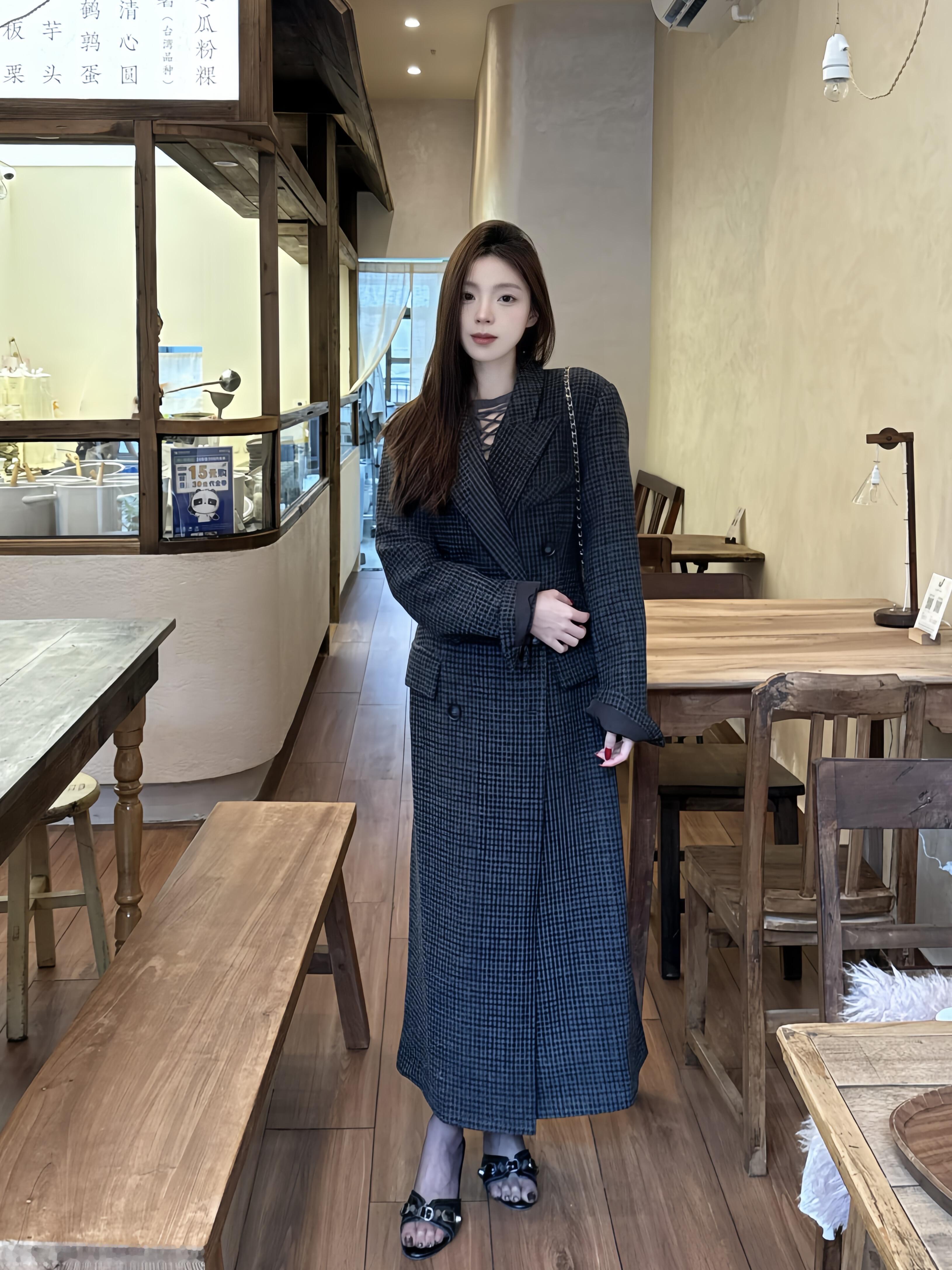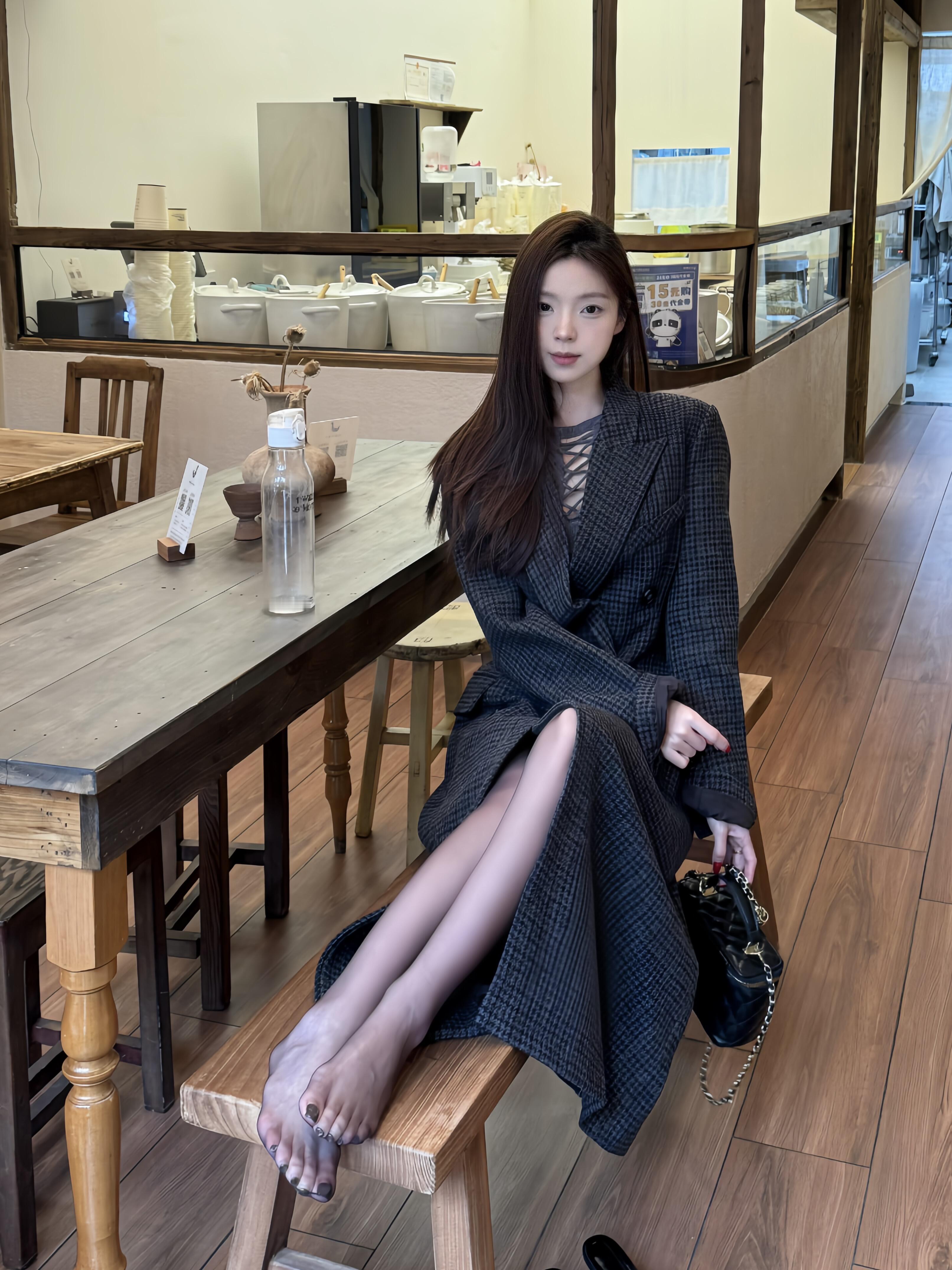 通勤穿搭|黑色大衣的精致干练,皮质短裙衬出苗条曲线,波点黑丝藏着性感妩...