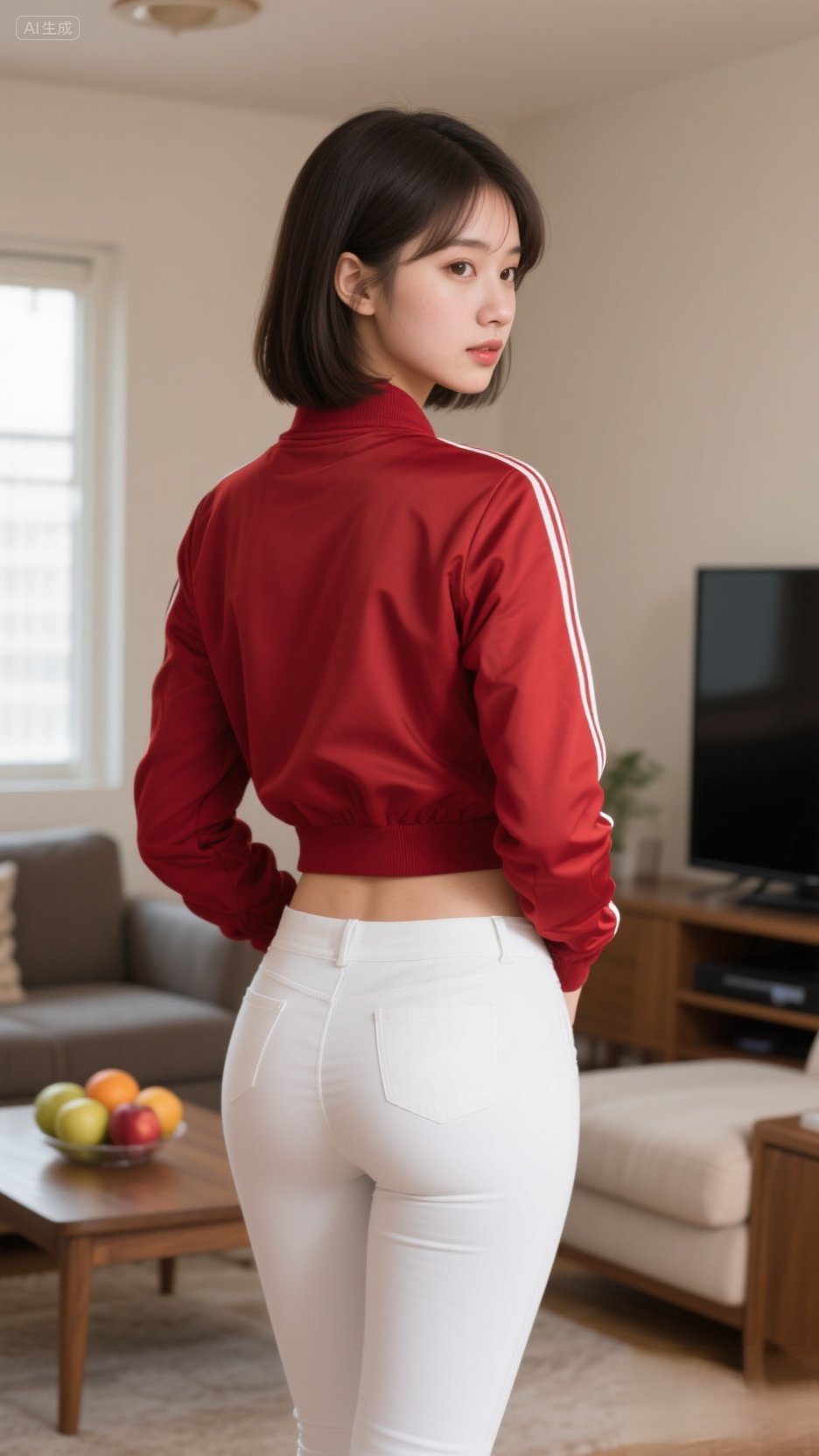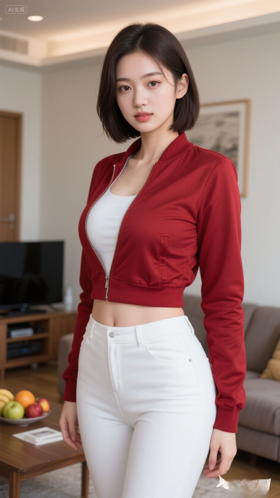 居家美女,学生头,穿着小款女式夹克。白色紧身裤。 眼神清澈,虽是淡妆...