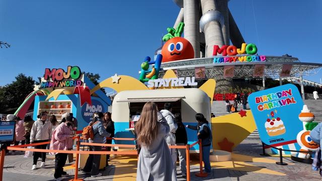 11月16日,东方明珠塔承接了五月天阿信的潮牌STAYREAL的粉丝经济溢出效应,推出全新企划“mojohappyworld”,开设快闪商店并推出名为“mojotastybuffet”的自助餐产品,品牌标志性的胡萝卜“卜卜”登上了直升机从陆家嘴的天空穿过。