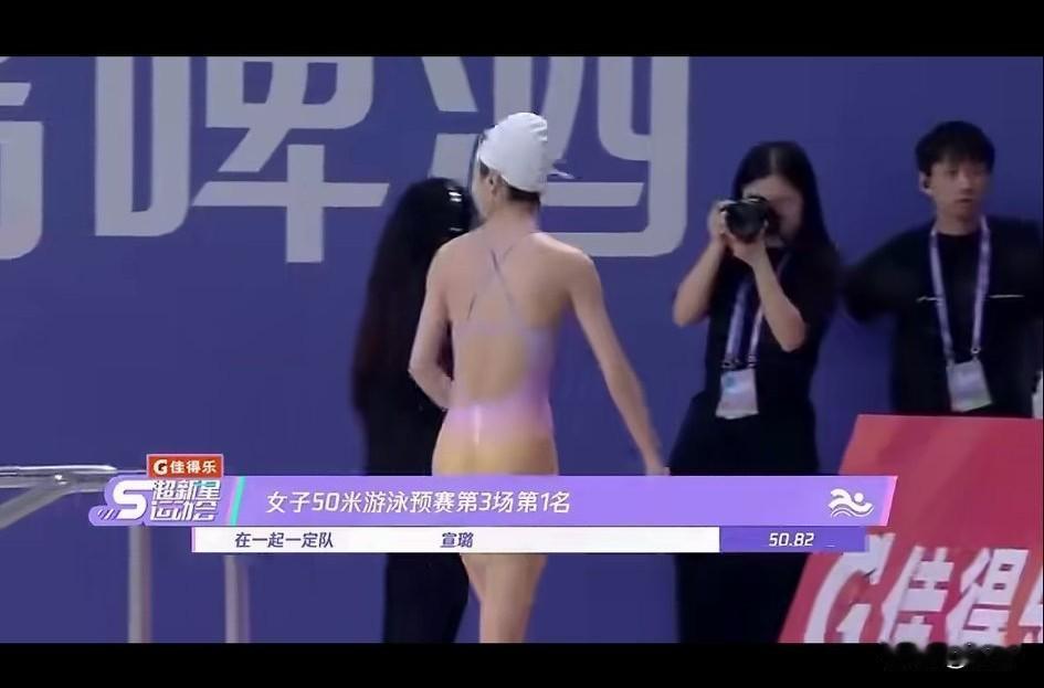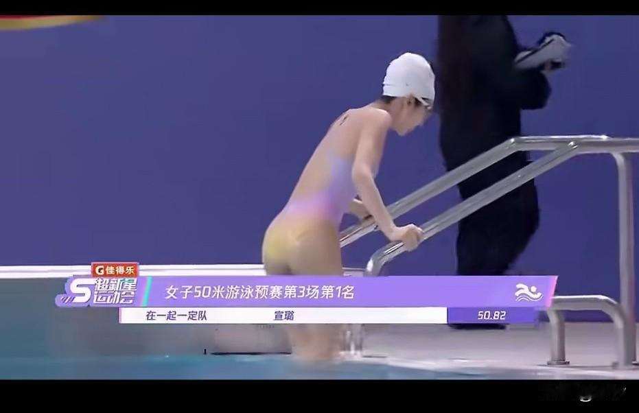 游泳运动员宣璐的身材绝了, 在50米游泳比赛预赛中, 她稳定发挥, 取的了第一名