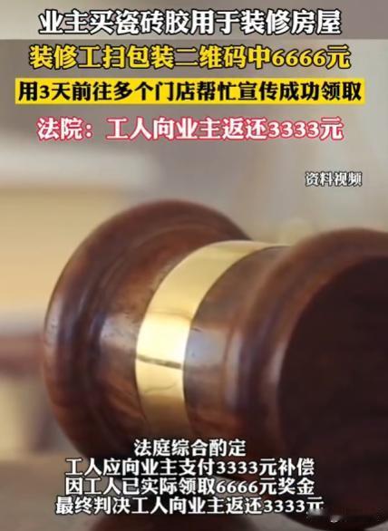 湖北咸宁,男子李某装修房子雇了贴砖师傅王某,施工时王某意外发现瓷砖包装二维码,扫码中了2万红包还抽到6666元奖金,李某得知后觉得奖金该归自己,要求王某返还遭拒,便将对方告上法庭,这奖金到底该归谁呢? (来源:咸宁中院) 李某为了装修出气派效果,花大价钱买了某品牌瓷砖。 装修那阵,李某忙工作,现场基本都交给王某负责。 王某干活实在,每天从早到晚,一点不偷懒。 有天王某干活累了,休息时瞅见瓷砖包装上有个二维码,他心里好奇,就拿出手机扫了扫。 这一扫不要紧,居然中了2万红包,接着又抽到6666元一等奖,王某当时都懵了,赶紧和品牌方确认。 品牌方确认无误后,邀请王某配合宣传,王某为了这事,还特意请假三天。 一个月后,奖金才到王某手里,王某拿到奖金,还想着,自己运气真好。 可这事没消停多久,2025年8月,李某不知从哪听说了王某中奖的事。 李某心里一下子就不平衡了,觉得这奖金就该归自己,毕竟瓷砖是自己买的,王某不过是在自己家干活时扫的码。 李某直接找到王某,要求王某把奖金还给自己。 王某一听,这哪行,自己扫的码,中的奖,凭啥给李某,王某态度坚决,一口回绝了李某。 李某见王某不肯给,觉得自己有理走遍天下,直接把王某告上了法庭。 这奖金归属问题,成了争议的焦点。 李某觉得,瓷砖是自己买的,王某是在自己家干活时扫码中奖,这奖金就该归自己,他觉得王某只是自己雇的工人,没权利拿这笔钱。 王某可不这么想,他认为自己是在工作间隙,偶然发现二维码并扫码中奖的,这完全是自己的运气,和李某没关系,自己付出了劳动,中奖也是自己的幸运所得。 从法律角度看,民法典规定,按份共有人对共有的不动产或者动产按照其份额享有所有权。那这瓷砖的所有权归属就很关键了。 李某买的瓷砖,瓷砖所有权归李某。 但王某扫码中奖的行为,和瓷砖所有权并没有直接关联。 扫码中奖是一种射幸合同行为,具有偶然性。 射幸合同,是指当事人一方是否履行义务有赖于偶然事件的出现的一种合同。 王某扫码中奖,是基于他自己的行为,而不是因为瓷砖所有权归李某。 所以,不能简单认为奖金就该归李某。 不过,这里有个问题,王某是在为李某装修房子期间扫码中奖的。 民法典第一百二十二条规定,因他人没有法律根据,取得不当利益,受损失的人有权请求其返还不当利益。 从公平原则角度考虑,王某获得全部奖金,对李某来说似乎不太公平,毕竟李某提供了中奖的载体瓷砖。 公平原则要求民事主体从事民事活动,应当遵循公平原则,合理确定各方的权利和义务。 王某和李某之间存在雇佣关系,王某在为李某提供劳务过程中获得意外之财。 民法典第一百一十八条规定,民事主体依法享有债权。债权是因合同、侵权行为、无因管理、不当得利以及法律的其他规定,权利人请求特定义务人为或者不为一定行为的权利。 王某的行为让李某受益,李某作为受益人,得给王某一定的补偿。 李某买了瓷砖,就该拿全部奖金,这种想法合理吗? 民法典规定,民事主体从事民事活动,不得违反法律,不得违背公序良俗。 李某这种想法,没有法律依据,违背了公平原则。 虽然王某扫码中奖有运气成分,但毕竟是在为李某装修房子期间发生的,从公平角度,适当退还部分奖金是合理的。 审理认为,考虑到抽奖规则,奖金原则上应归买瓷砖者李某,王某的确有付出和贡献,应该给予他一定的补偿。按王某的日工资标准,酌情让他退还3333元给李某。 最终,法院依据公平原则和相关法律规定,判定王某退还李某3333元,王某也当庭立即履行了。 在面对意外之财时,要保持理性。既不能贪图不属于自己的利益,也要懂得维护自己的合法权益。