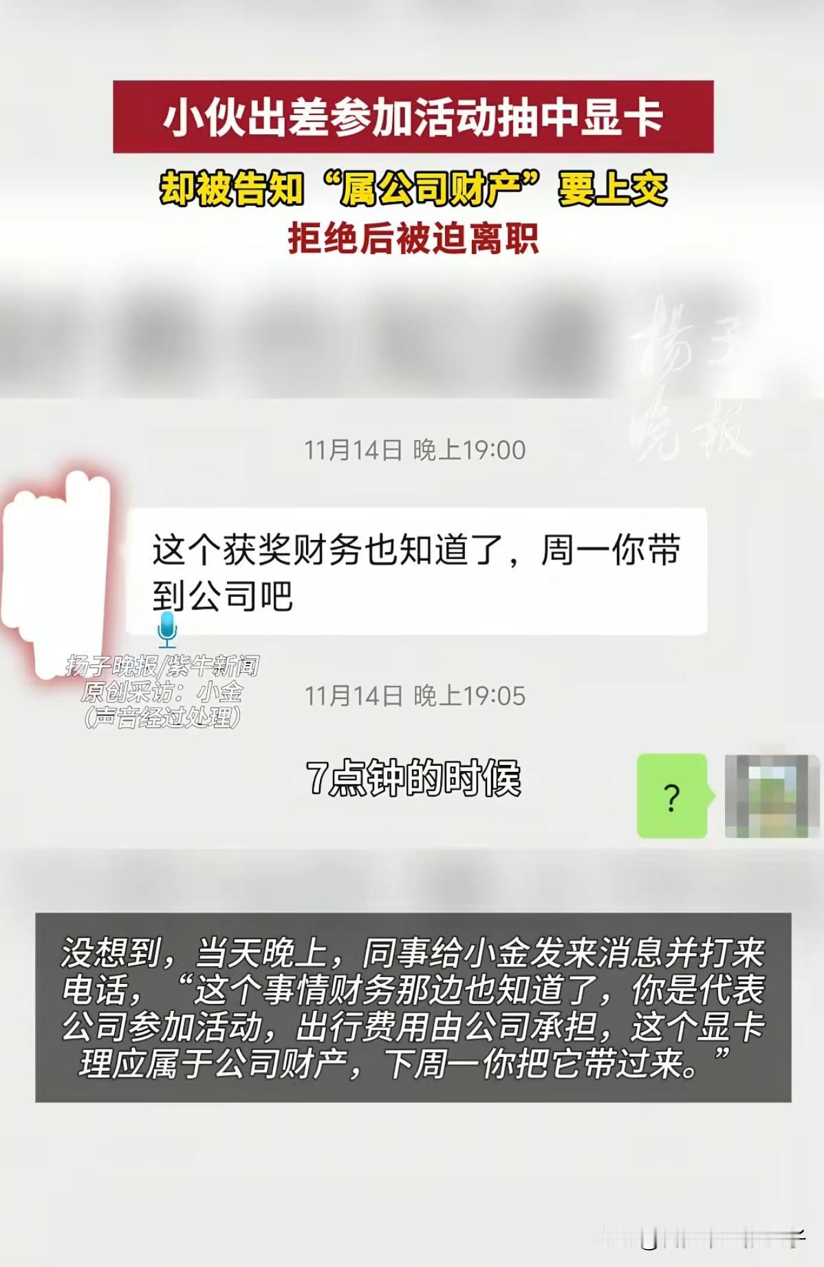 上海,男子和同事受公司安排,一同到苏州参加英伟达的活动,同事嫌麻烦便没有参与现场的抽奖,而男子则趁上厕所的间隙,去各个展位完成了盖章,获得了抽奖的资格。 没想到男子中了大奖,获得高端显卡一张,公司得知后要求男子上交,说这是公司的财产,小伙虽拒绝上交保住了显卡,但最后公司也劝退了小伙离职。 特意去查了这个事,公司要求男子上交显卡是否合理暂且不说,其实最恶心的是和他一起出差的同事。 他嫌麻烦不去集,看到别人中奖了就想分钱,男子不愿意,还假装给男子说公司已经知道了,结果男子去财务问才发现公司根本不知道这事! 虽然参加活动是公司安排的,但抽奖是个人行为,不是公司要求的,况且同事还嫌麻烦没参加,如果是公司要求他抽奖,那中奖了奖品属于公司那无可争议。 另外,反过来想假如事先知道公司会回收奖品,那么谁又愿意去参加抽奖呢? 所以,个人认为这张显卡应该归小伙,公司连张3000元的显卡都舍不得,还要劝退员工,太小气了,您觉得呢?