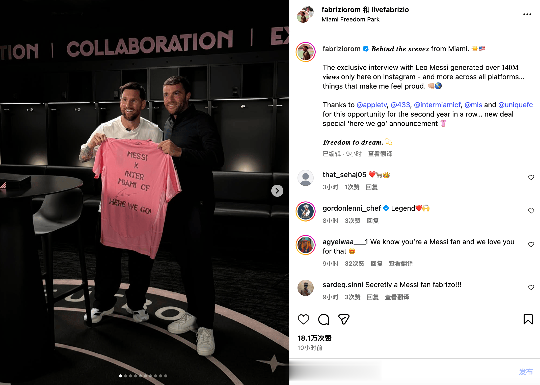 虎扑11月21日讯近日,知名转会记者罗马诺在社交平台发文,回顾自己在迈阿密对梅西的独家专访。他透露,这期采访相关内容仅在Instagram上的播放量就超过1.4亿次。