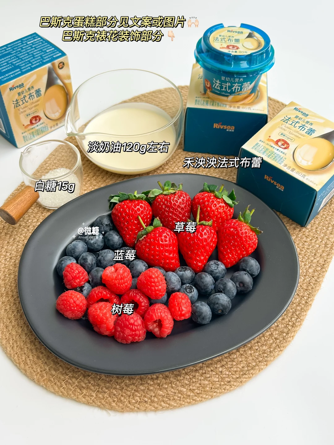 装饰部份:禾泱泱法式布蕾,草莓,树莓,蓝莓,淡奶油50g,白糖8g