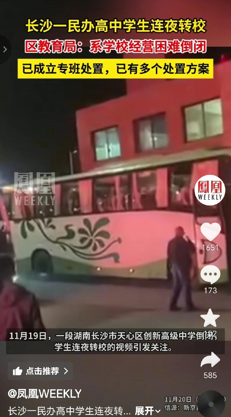 近日湖南长沙市一民办中学,因为经营困难倒闭,据悉该学校是一所2022年建校的营利性民办高中,导致在校学生约700人连夜转校。目前 区教育局已成立专班处置,有多个方案可供选择:中考586分以上的学生可转至其他公办学校;也可选择转公办中职,公办中职不限分数;还可留在耀华中学继续就读。(来源于@凤凰WEEKLY)