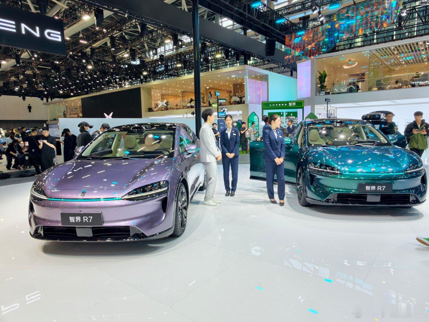 来智界展台看我的智界R7啦!没想到人还挺多啊!你们觉得我的碧波青好看还是这两个色