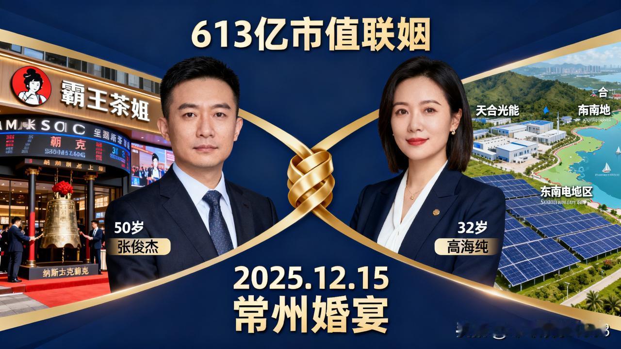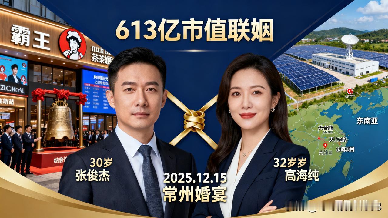 商业圈又有大喜事啦!霸王茶姬 90 后董事长张俊杰,即将与 “最美光二代”、天合光能董事长高海纯步入婚姻殿堂,婚宴定在 12 月 15 日。女方高海纯 32 岁,比 30 岁的张俊杰大两岁。这两家上市公司市值加起来约 613 亿,这场联姻堪称 “强强联合”。 原来,两人是在青年企业家学习活动中相识的。在学习交流里,他们互相欣赏彼此的才华与能力,感情逐渐升温。 而他们的结合,对霸王茶姬和天合光能的发展也可能产生深远影响。双方或许能在资源、渠道等方面实现共享,拓展业务版图,创造更多商业机会。这不仅是两个人的喜事,也让大家对两家企业的未来充满期待,让我们一起祝福他们,也期待他们的企业能有更好的发展!