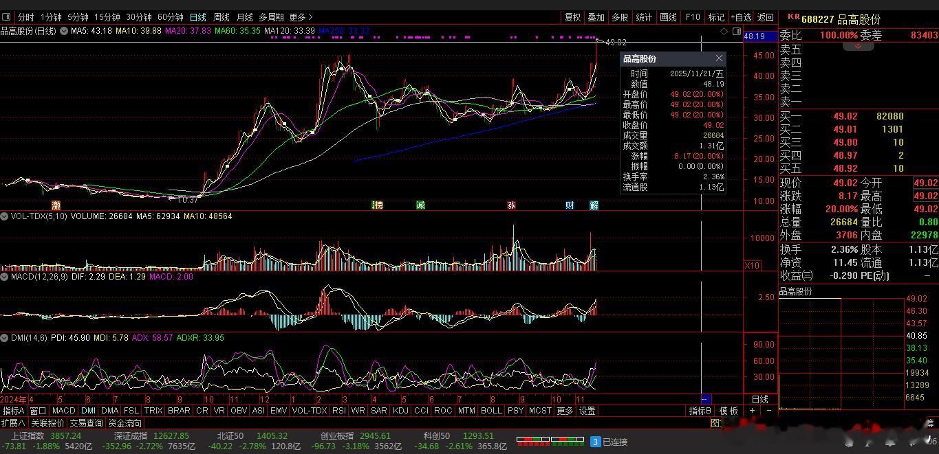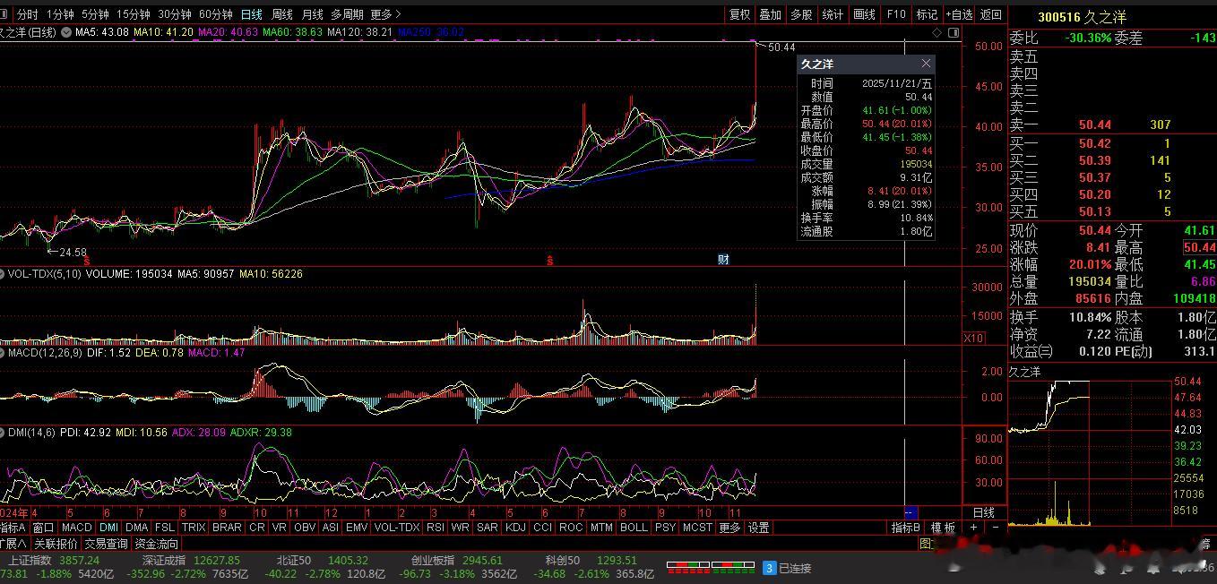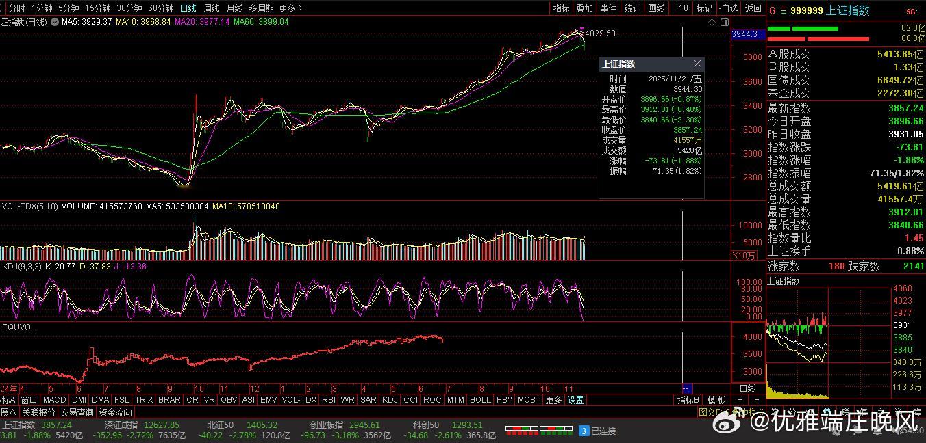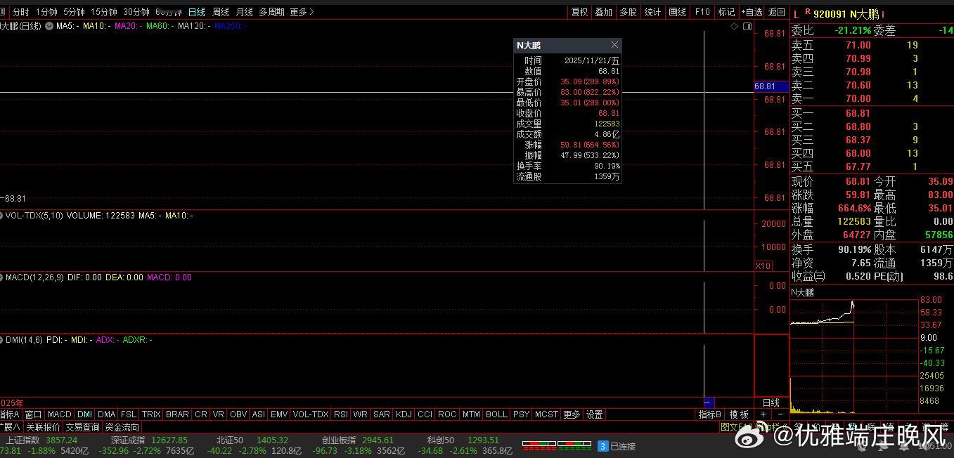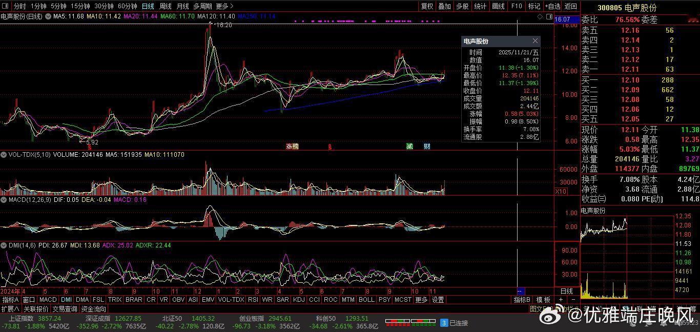 【财富晚茶】午盘透析(11.21):北证跌幅2.78%:渔业反弹能源回调导语:作者系《网易号》优质财经领域创作者。曾经原创作者和知名网易号旅游领域创作者。大跨度行业等的写作,颇受网友喜爱。作品发表于2025.11.21.12:18 优雅端庄晚风。(标题照片:全球证明渔场)【内容概述】今日股市午评:截止11:30:沪指:贡献1根阳线4阴线。深指:贡献2根阳线3阴线。沪指跌破:阻力位:03967点。沪指跌破:支撑位:0392点。深指突破:阻力位:13226点。 深指跌破:支撑位:12970点。追寻盘面:沪深低开一泻千里,尾盘空头抛筹竞赛。一、透析市场:风口公司,上下起伏300805 电声股份 盘中01涨1、突破四年箱底视野盘面:前期三顶:轻松超越。2025-11-21截至11:30:股价报收:12.01元。该股上涨:4.16%。成交总量:206658手,成交金额:2.47亿元。总换手率7.17%,观总市值:51.01亿元。流通市值:34.71亿元。2、零售终端翘楚主营业务:互动展示零售终端管理-品牌传播营销等研产和销售。公司品牌:国内领先科技驱动新场景体验营销综合服务提供商。3、营收净利优秀财报透视:2025-09-30 三季度报:公司营收:18.4763亿 同比增12.09%。公司净利:3358.8209万 同比增449.84%。二、沪深绿盘:空方强势,悲剧股市今天目击:沪深北市:早盘:低开一跌,一涨六跌。尾盘:一涨一跌,次低绿盘。看点之一:沪深北证:中船系、农业种植相对抗跌。看点之二:一黑天鹅:锂电池产业链重挫。看点之三:沪深北市:半日成交:1.32万亿元。盘面追踪:4956股飘绿。三、沪深阴棒:个股弱势,亏钱效应沪深追踪:截至午间:市场收盘:沪指跌1.88%报3857.24点,深指跌2.72%,创指跌3.18%,北证50指跌2.78%,沪深北市:合计成交:1.32万亿元,较前一交易日放量约2000亿元。四、盘面观察:渔业脉冲,能源回落1、板块扫描透析沪深板块:板块走强:渔业、中船系、种植产等。板块走低:能源、电池、有机硅等。板块上扬:保险、券商等。产链重挫:锂锂电池等。概念活跃:种业、水产、军贸等。2、个股涨跌起伏VV沪深北市:多空遭遇。474股票上涨,32涨停板。4956股票下跌,64股跌停板。沪深北市:合计成交:1.32万亿元。午盘视野:沪深低开二次探底,尾盘杀跌筹码躺底。1、今日涨幅谁家主旋律:天经地义:风口股票涨停板920091 N大鹏 300516 久之洋 688227 品高股份第一、涨幅榜眼排行榜-1:920091 N大鹏主营业务:工业精密清洗装备-装备升级改造-工业清洗剂备件服务等的研产和销售。公司品牌:国内领先精密工业清洗系统配套服务的供应商。排行榜-2:300516 久之洋主营业务:红外热像仪-激光传感器-光学镜头-星体跟踪器研产和销售。公司品牌:细分领域隐形冠军。排行榜-3:688227 品高股份主营业务:云计算业务-行业信息化的研产和销售。公司品牌:垂直领域全栈自主可控解决方案领先者。第二、综评榜技术看盘-1:920091 N大鹏。潜力股票-1:920091 N大鹏:国内领先精密工业清洗系统配套服务的供应商。风险股票-1:暂时没有:即无301092 争光股份。2、今日跌幅谁家主旋律:摇摇欲坠:弱势股票涨停板300390 天华新能 300475 香农芯创 300959 线上线下跌幅榜-1:300390 天华新能主营业务:防静电超净技术产品研产和销售。公司品牌:中国静电与微污染防控领域的领先企业。跌幅榜-2:300475 香农芯创主营业务:电子元器件分销-家用电器核心零部件等研产和销售。公司品牌:半导体产业链的组织者和赋能者。跌幅榜-3:300959 线上线下主营业务:移动信息服务-企业短信-流量业务的研产和销售。公司品牌:中国领先移动互联网运营支撑服务商。六、创作不易:优质网易,财经作者投资投机迷茫之中:给予尽可能有帮助:资本市场风险自负。(优雅端庄晚风《网易号》财经领域创作者和原创作者 违者必究)