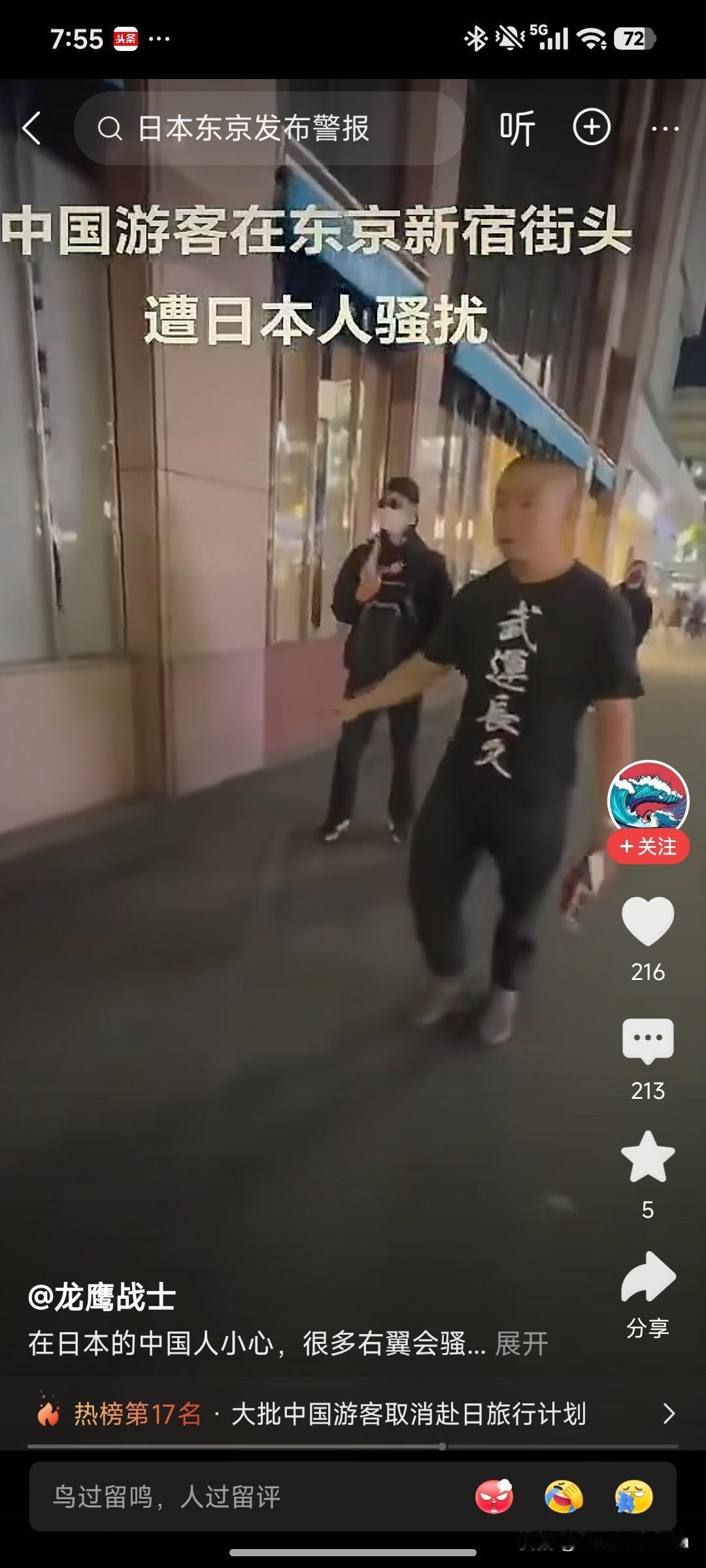 在日本中国游客遭到极端军国主义骚扰。黑衣男子衣服上写着“武运长久”这军国主义色彩字眼。部分日本人对华人也有偏见和不友好。