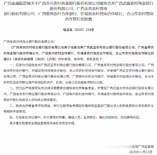 11月21日金融一线消息,日前,广西金融监管局发布批复称,同意广西来宾农村商业银行吸收合并广西武宣农村商业银行股份有限公司、广西金秀农村商业银行股份有限公司、广西象州农村合作银行、忻城县农村信用合作联社、合山市农村信用合作联社,并承继广西武宣农村商业银行股份有限公司、广西金秀农村商业银行股份有限公司、广西象州农村合作银行、忻城县农村信用合作联社、合山市农村信用合作联社清产核资后的资产、负债、业务以及其他各项权利义务。