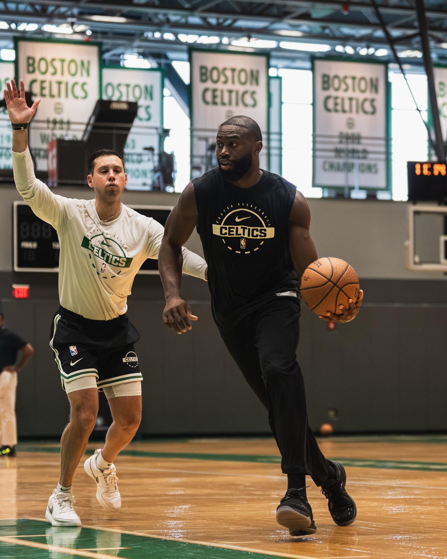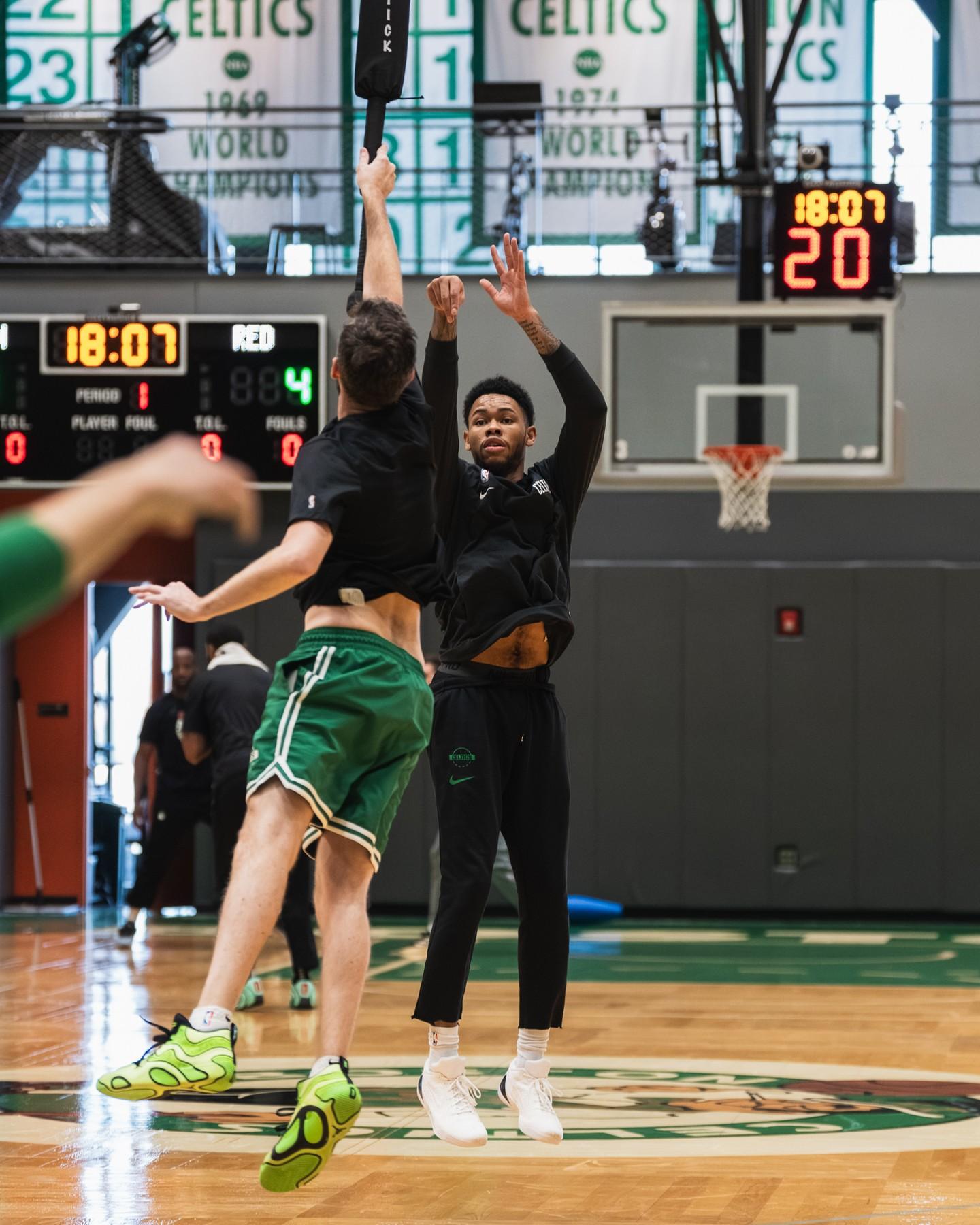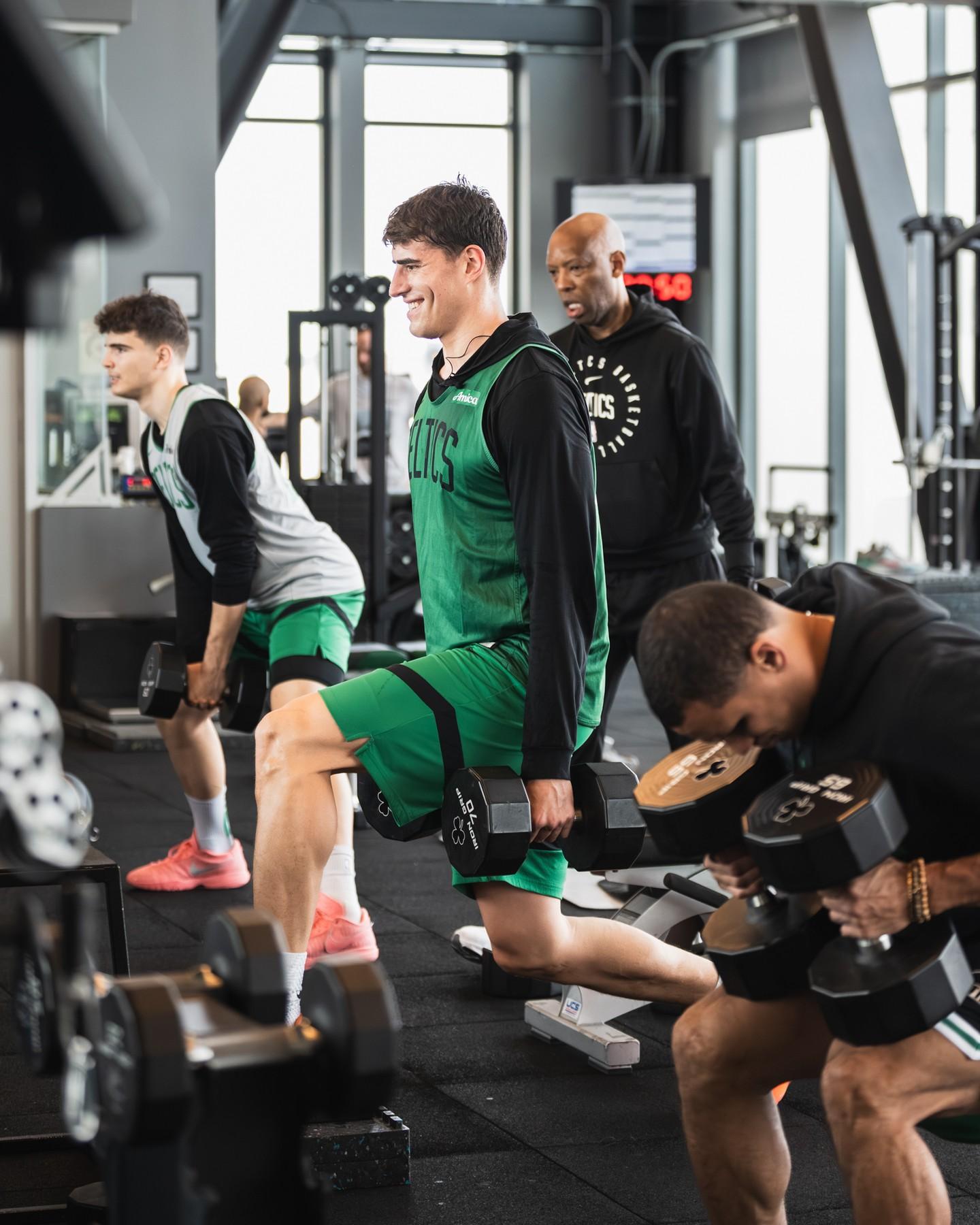 “全队在训练馆里专心训练!”凯尔特人官方附文道。