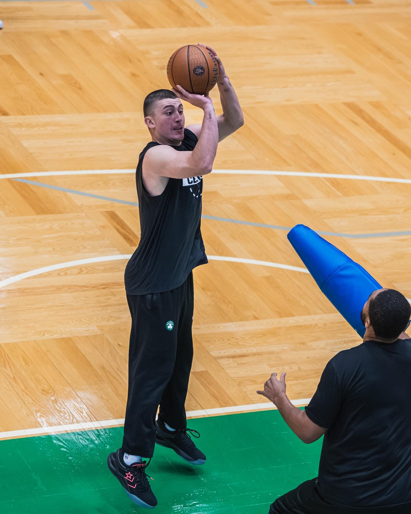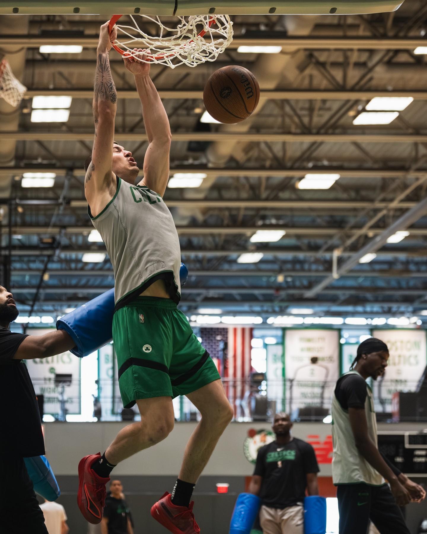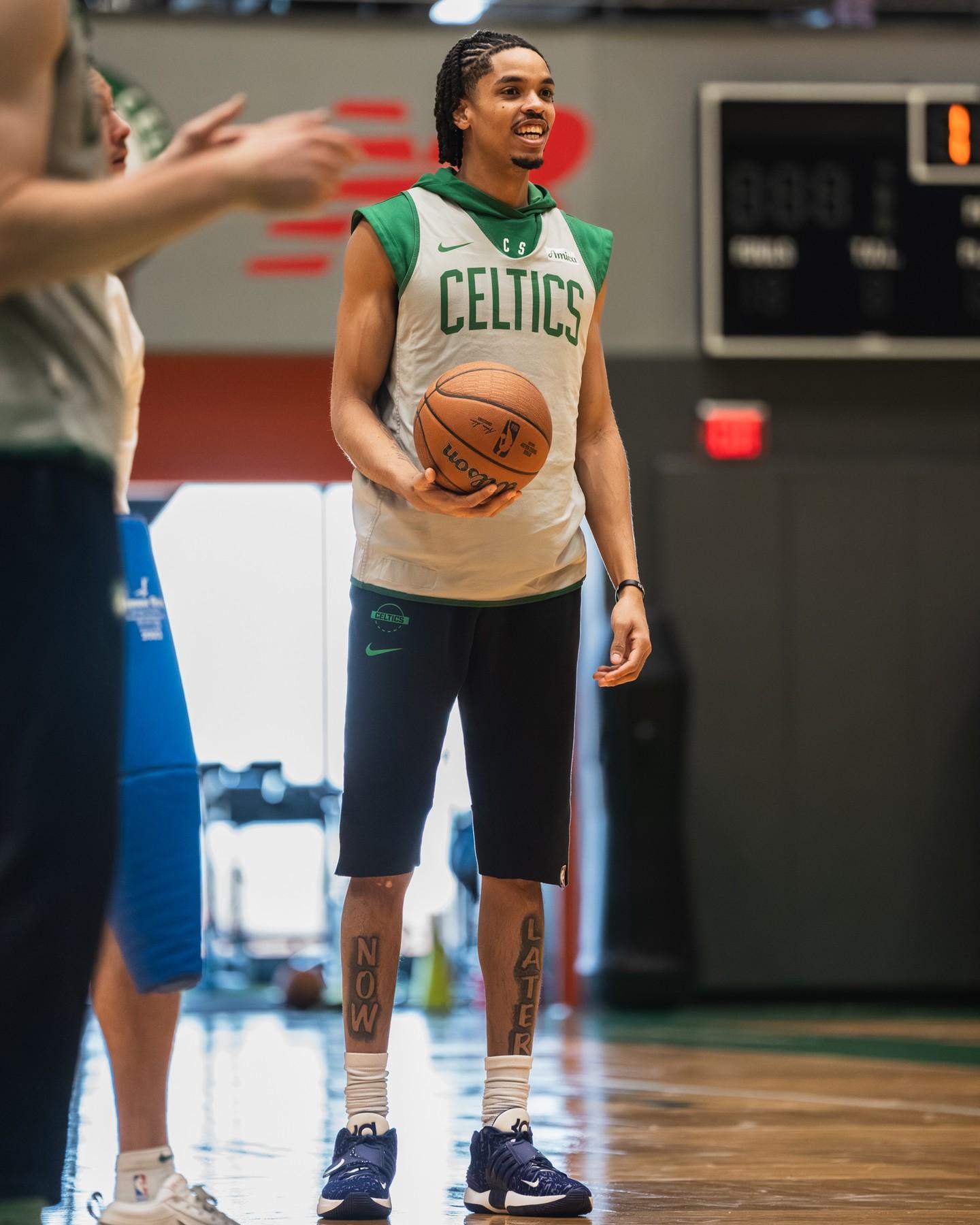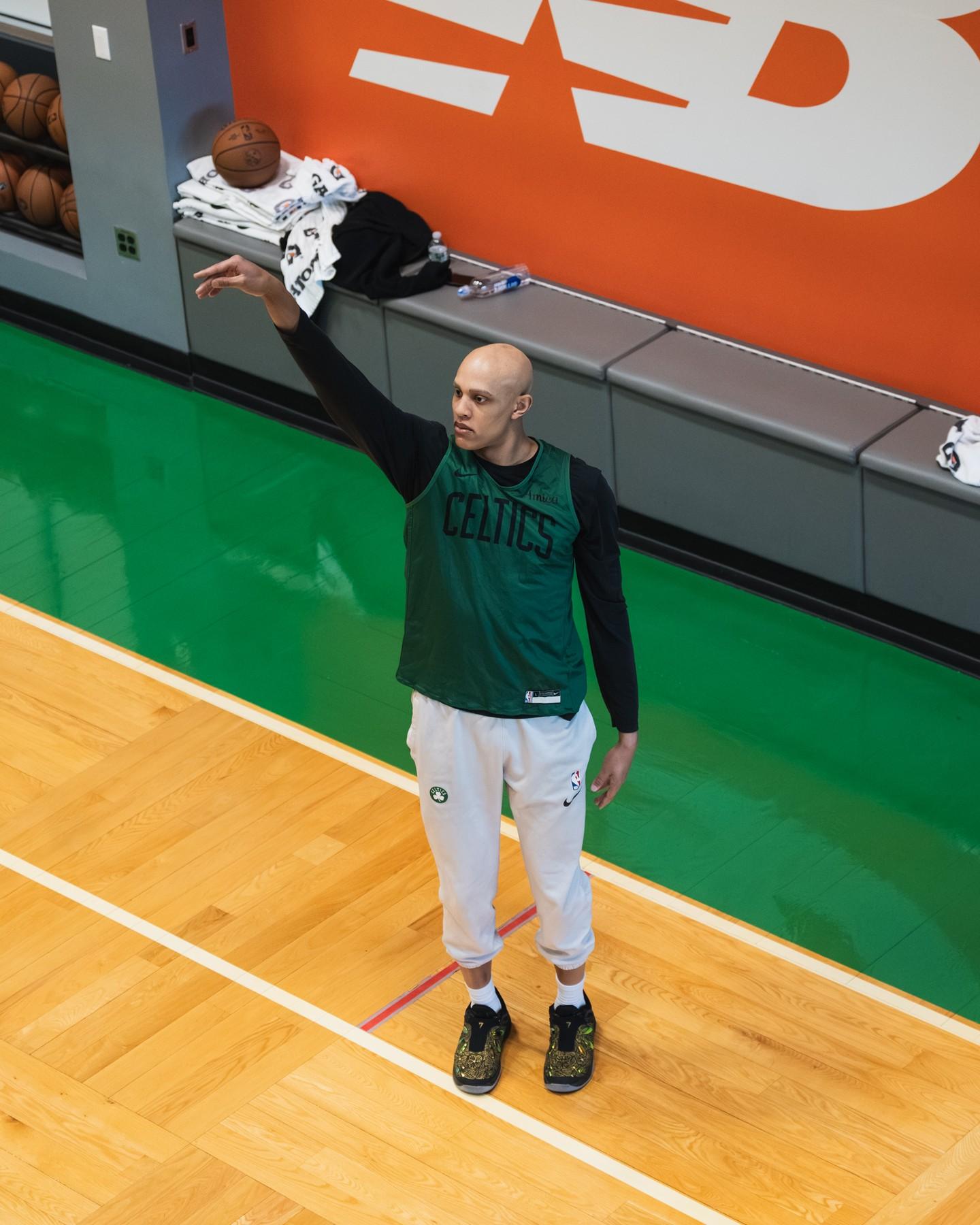 “全队在训练馆里专心训练!”凯尔特人官方附文道。