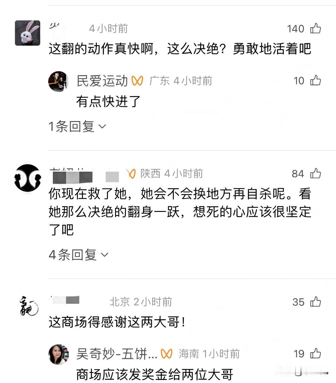 这是有多绝望!四川成都,女孩想不开要跳楼,幸好旁边男子迅速反应,救下了女子,然而女子得救后,居然又跳了下去,万幸男子拼命抓住了她的手!网友:“死的是真想死,救的是真心救!” 幸亏这位大哥眼疾手快,在路人的帮助下,两次救了女孩的命。 这个事我觉得,女孩既然死都不怕,还有什么可怕的,人命大于天,啥事能比你的命重要啊,好好活着吧,不是每次都那么幸运,要感谢几位好心人的救命之恩。 有啥难事也要学会放下,没有过不去的坎,上天有好生之德,一切都可以重新开始,加油! (信息来源:新浪新闻)