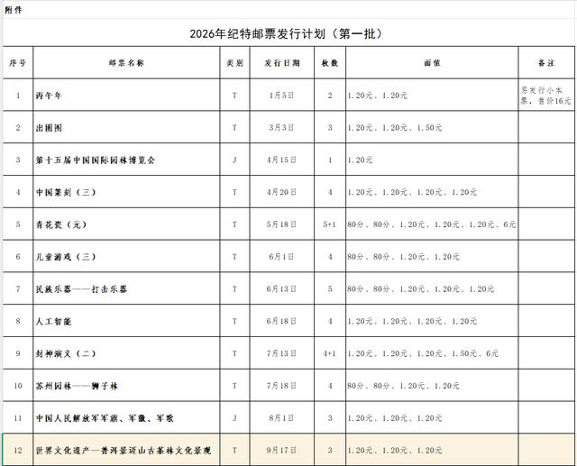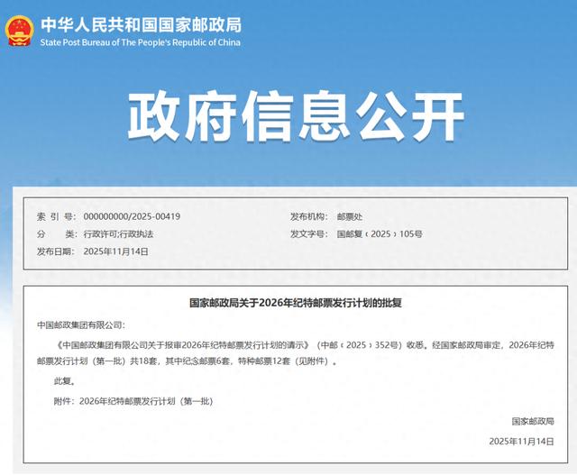 11月14日,国家邮政局公布了《国家邮政局关于2026年纪特邮票发行计划的批复》。批复提到,经国家邮政局审定,2026年纪特邮票发行计划(第一批)共18套,其中纪念邮票6套,特种邮票12套。在18套纪特邮票中包含了《世界文化遗产——普洱景迈山古茶林文化景观》特种邮票(1套3枚),将于2026年9月17日“普洱景迈山古茶林文化景观”申遗成功三周年当日正式发行。