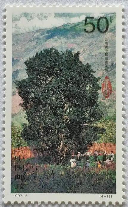 △1997年由国家邮政局发行的《茶》特种邮票第一枚(4—1)《邦崴过渡型古茶树》