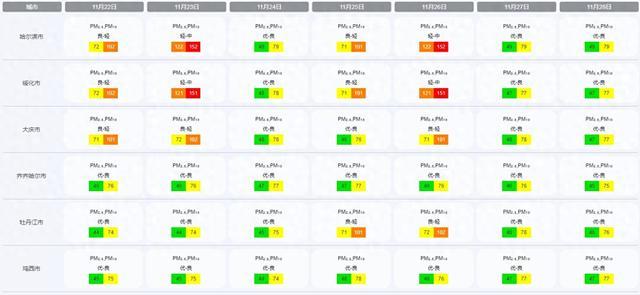 根据预测,22日,哈尔滨、绥化、大庆、佳木斯、七台河地区,PM₂.₅与PM₁₀值分别大于70与100,空气质量为良好至轻度污染状态,全省其他地区,空气质量为优良状态。