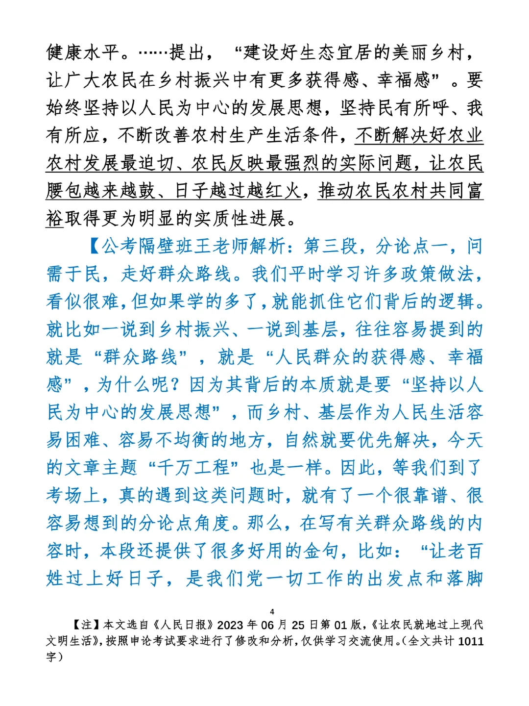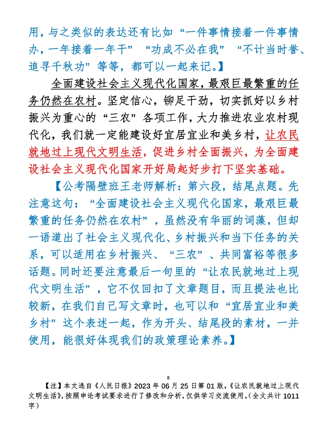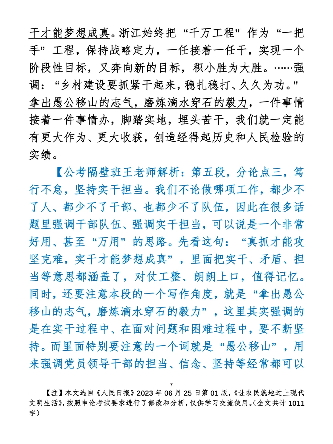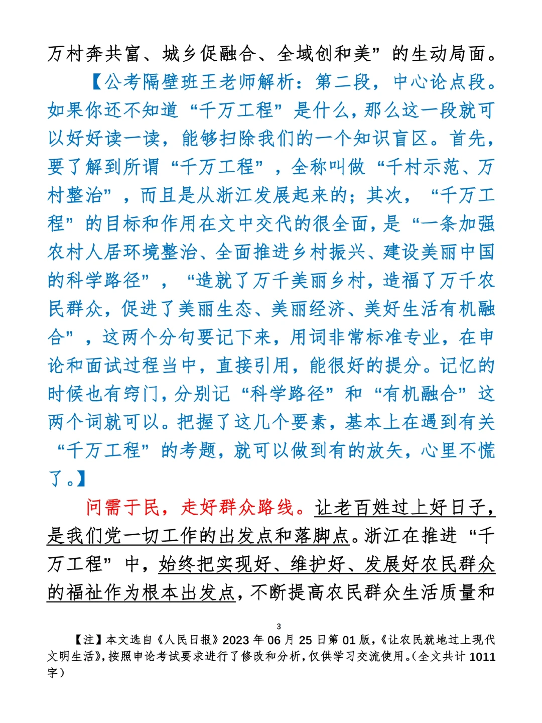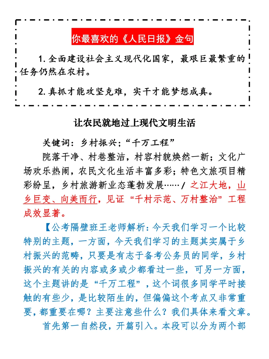 如何抄写:每日抄写文章发在“公考隔壁班王老师”账号,红色字是重点句和结构句,黑色字是正文,蓝色字是解析,大家抄写时不必抄蓝色字。建议先通读全文,做到心中有数再开始抄写,效果会更好。 关于文章:抄写文章来源于人民日报,但每篇文章我都根据申论考试要求进行了修改:一是重写或修改开头、结尾;二是统一段首句句式结构;三是调整段落字数,使文章结构更均衡;四是简化复杂长难句,使之更具可模仿性。每篇文章无论修改多少,都是基于申论考试要求,毫无对人民日报文章品评之意。(此处致敬人民日报)