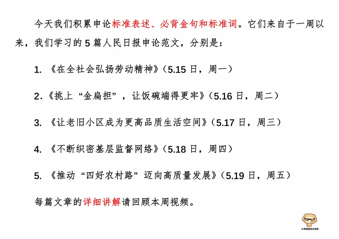 今天我们积累申论素材、必背金句和重点知识。它们来自于一周以来,我们学习的5篇人民日报申论范文,分别是: