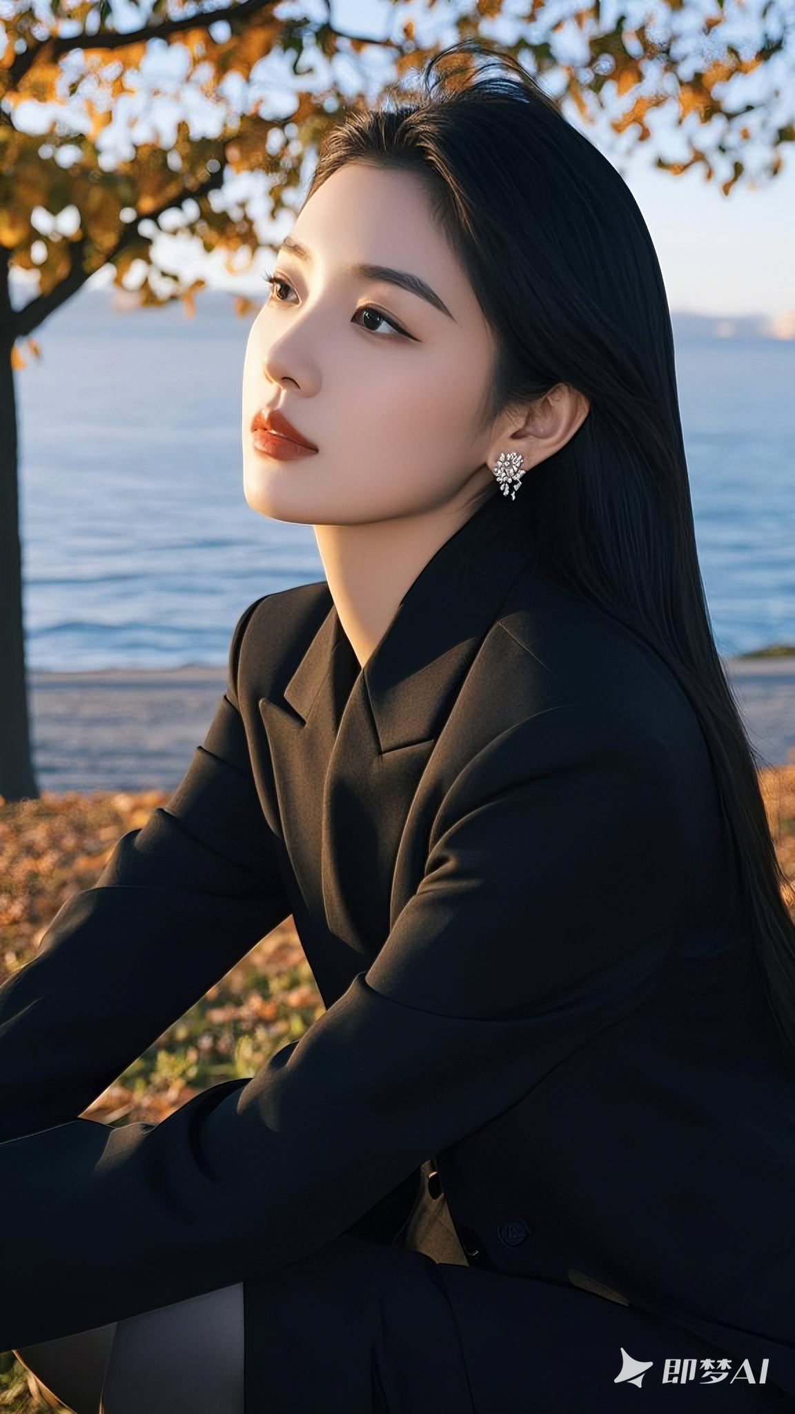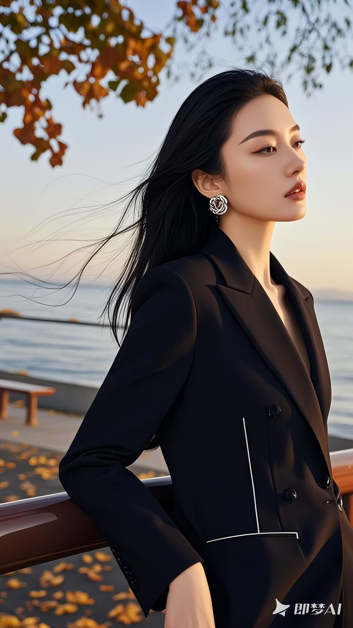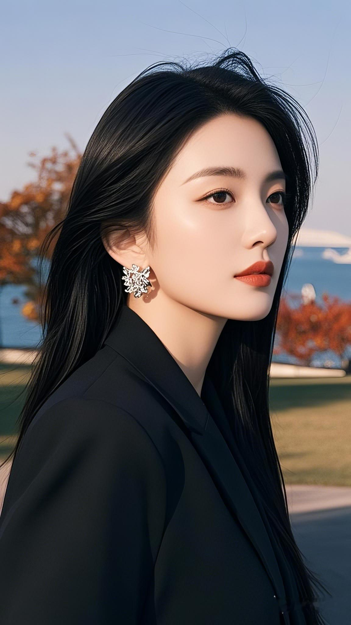 黑色披发,美丽知性的面容,秋天公园海边,夕西下,微微侧身,抬头看着远方若有所思。斩男穿搭 完美身材 美丽坏女人 美女