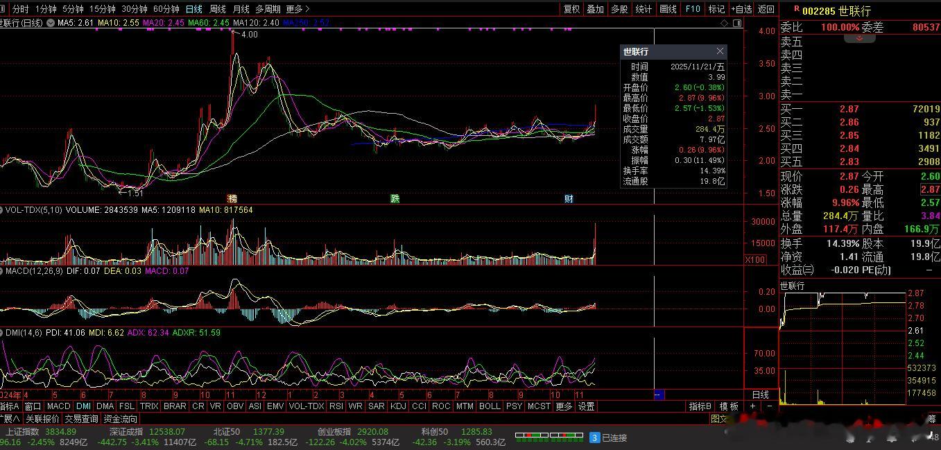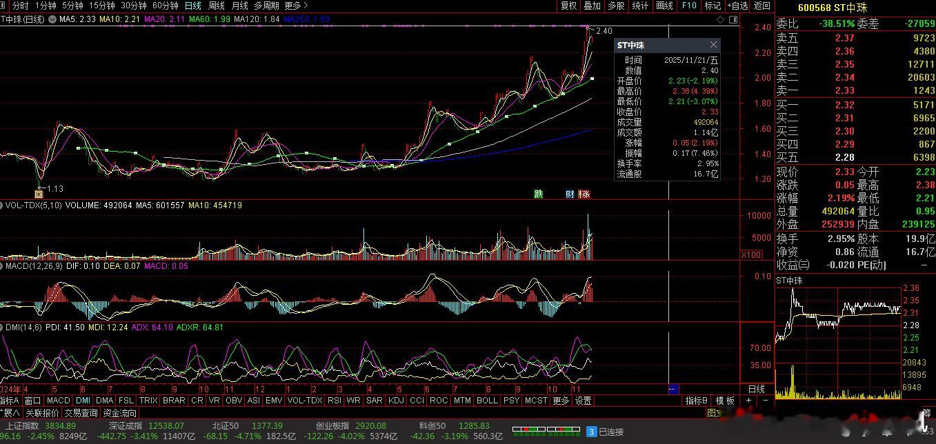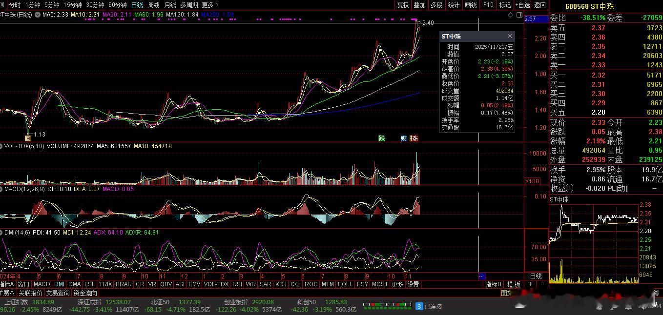 【财富晚茶】三元股市收评:沪指跌2.45%:广告强势上扬电池探底导语:作者系《网易号》优质财经领域创作者。曾经原创作者和知名网易号旅游领域创作者。大跨度行业等的写作,颇受网友喜爱。作品发表于2025.11.21.15:18优雅端庄晚风。(标题照片:全球著名广告:华为享界×沈腾《想界样就界样》)一、瞧ST中珠:三年筑底600568 ST中珠 盘中01涨1、八年筑底:底部震荡今日视野:扎实四底:刷新前高。2025-10-21 截止15:00:收盘股价:2.33元,上涨2.19%。成交总量:492064手 。成交金额:1.14亿元。总换手率:2.95%。总市值达:38.89亿元,流通市值:38.89亿元。2、肿瘤治疗:头部企业主营业务:药品研产和销售-肿瘤治疗领域产销-住宅地产开发。公司品牌:大健康-肿瘤治疗头部企业。3、营收良好:净利减亏业绩减亏:2025-06-30 半年度报:公司营收:3.0285亿 同比增20.29%,实现-2413.7249万 同比增63.04%。二、多空搏杀:沪深绿盘1、追踪盘面:蛛丝马迹。早盘:低开二涨,五跌三涨。午盘:一涨七跌,二涨一跌。尾盘:一涨一跌,次低绿盘。看点之一:沪深股指:股指低开:瞬间见底,做多夭折。看点之二:三只乌鸦:深创北指:跌幅超3%。看点之三:沪深北市:合计成交:1.98万亿元。场内个股:5072股飘绿。2、板块涨跌:风口依然涨跌观察:板块见证。板块拉升:数字媒体、渔业、广告等。板块走低:能源金属、林业、冶钢原料等。概念活跃:种业、水产品、军贸等。3、技术看盘:涨跌位置观K线提示:精彩多空博弈。沪深两指预测:11月24日:沪指突破阻力:03912点看涨,前程似锦;跌破支撑位:03834点看跌,日暮途穷。深指突破阻力:12812点看涨,鹏程万里;跌破支撑位:12538点看跌,不堪造就。三、三元板块:风口潜水1、追踪盘面:视角视野三元超弱恐慌,沪深巨量杀跌。6股上涨,涨幅5%以上:2股涨停板。117股下跌,跌幅5%以上:53股跌停板。涨幅0%:0股0停板。涨幅0.00%+上涨个股:0+6=6股票赚钱。沪深两市:合计成交1.98万亿元。总体归纳:三元股票:盘口弱势。2、追踪盘面:主力进退换位思考:沪深阴霾,尾盘再跌。沪指距9:31-15:00:前2小时放量盘跌,中1小时略量盘升,后1小时略量盘跌。深指距9:31-15:00:前2小时放量盘跌,中1小时略量盘升,后1小时略量盘跌。沪深两市:合计成交:1.98万亿元。四、透析个股:聚焦涨跌1、涨幅榜眼:处排查摸主旋律:涨幅榜之中:寻找启动002285 世联行 300379 *ST东通 600568 ST中珠涨幅榜-1:002285 世联行主营业务:房地产的研造和销售。公司品牌:中国城市空间集成服务商。涨幅榜-2:300379 *ST东通主营业务:基础软件中间件产品的研造和销售。公司品牌:中国中间件领导者大安全信息提供商。涨幅榜-3:600568 ST中珠主营业务:药品研产和销售-肿瘤治疗领域产销-住宅地产开发。公司品牌:大健康-肿瘤治疗头部企业。2、跌幅榜眼:处排查摸主旋律:跌幅榜之中:寻找金子300152 ST新动力 600340 华夏幸福 300477 ST合纵跌幅榜-1:300152 ST新动力主营业务:节能点火特种装备-燃烧控制系统等研造和销售。公司品牌:中国电站动力锅炉自动点火技术的开创者和头部企业。跌幅榜-2:600340 华夏幸福主营业务:产业新城-商业地产。公司品牌:中国产业新城服务商。跌幅榜-3:300477 ST合纵主营业务:配电变电控制设备-锂电池正极前驱体研造和销售。公司品牌:一流配电智慧能源领域系统解决方案服务商和先进锂电池材料前驱体供应商。3、潜力榜眼:处排查摸主旋律:潜力榜之中:寻找估值002496 *ST辉丰 300301 *ST长方 000669 ST金鸿潜力榜-1:002496 *ST辉丰主营业务:生物农资-农资电商-石化仓储供应链-项目投资。公司品牌:中国领先亚临界小分子高温裂解工艺高科技专利产品和头部企业。潜力榜-2:300301 *ST长方主营业务:LED照明光源器件。公司品牌:LED照明光源器件头部企业。潜力榜-3:000669 ST金鸿主营业务:天然气。公司品牌:国内最具实力的综合性清洁能源服务商。五、本创作者:优质网易投资投机迷茫之中:给予尽可能有帮助:资本市场风险自负。(优雅端庄晚风《网易号》优质财经领域创作者和原创作者; 违者必究)