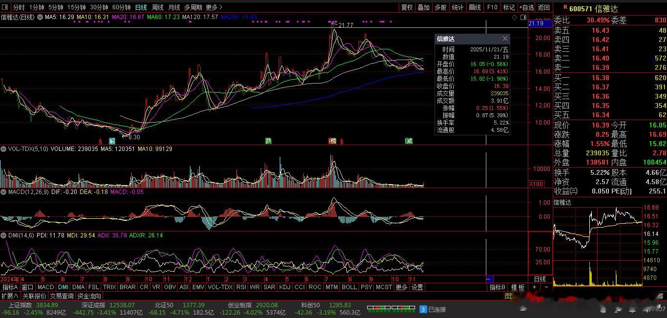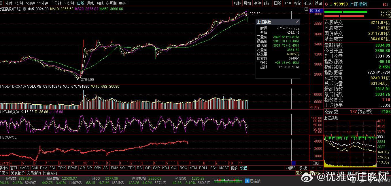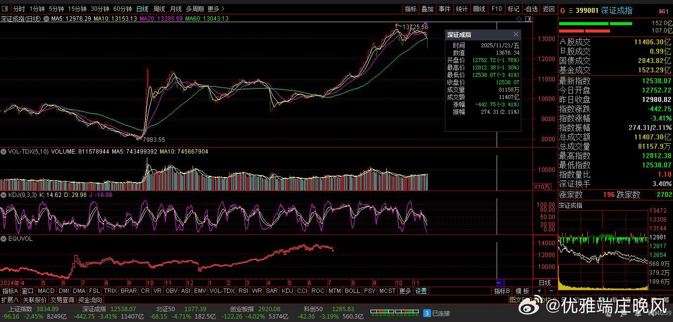【财富晚茶】今日股市收评:深指跌3.41%:种业震荡回升锂矿杀跌导语:作者系《网易号》优质财经领域创作者。曾经原创作者和知名网易号旅游领域创作者。大跨度行业等的写作,颇受网友喜爱。作品发表于2025.11.21.15:18优雅端庄晚风。(标题照片:全球最佳种植园:英国邱园(Kew Gardens):作为联合国教科文组织世界遗产)一、视野焦点:恰似“火眼金睛”600571 信雅达 盘中01涨1、突破八年箱顶视野盘面:前期双顶,企稳脉冲:2025-11-21 截至15:00:股价报收:16.39元。股指上涨1.55%。成交总量:239035手,成交金额:3.91亿元。总换手率5.22%,观总市值:70.03亿元。流通市值:70.03亿元。2、金融软件翘楚主营业务:银行等金融机构软件的研产和销售。公司品牌:全球40国客户金融科技服务-国内银行业客户覆盖率行业领先。3、营收净利优秀业绩好转:2025-09-30 三季度报:公司营收:13.9135亿 同比增9.02%。公司净利:2247.4891万 同比增492.43%。二、空方强势:恰似“弱肉强食”1、博弈追踪盘面第一、沪深盘面透析沪深回放:跌宕起伏。早盘:早盘:低开二涨,五跌三涨。午盘:一涨七跌,二涨一跌。尾盘:一涨一跌,次低绿盘。第二、透析沪深指数追寻沪深:跌宕起伏。沪指跌2.45%(096.19点),报03834.89点,成交额08249亿。深指跌3.41%(442.75点),报12538.07点,成交额11407亿。创指跌4.02%(112.26点),报02920.08点,成交额05374亿。北指跌4.71%(068.15点),报01377.39点,成交额00182亿。沪深北市:合计成交:1.98万亿元。2、复盘沪深个股第一、今日个股视野今日观察:涨跌互动。354上涨,34个股涨停板。5072股下跌,120跌停板。沪深北市:合计成交1.98万亿元。三、沪深阴棒:恰似“满天阴霾”1、洞察机构尾盘主旋律:沪深快跌,尾盘穿底。沪指距9:31-15:00:前2小时放量盘跌,中1小时略量盘升,后1小时略量盘跌。深指距9:31-15:00:前2小时放量盘跌,中1小时略量盘升,后1小时略量盘跌。沪深两市:合计成交:1.98万亿元。四、资金流向:恰似“水落石出”1、目击主力资金Wind统计显示:主力资金今日净流出37.87亿元;其中,创业板主力资金净流出127.46亿元;沪深300成份股主力资金净流出85.93亿元;科创板主力资金净流出2.51亿元。所属的31个一级行业,今日有9个行业主力资金呈现净流入,其中,国防军工行业主力资金净流入最多,净流入金额为:17.29亿元;行业主力资金净流入居前:机械设备、公用事业、家用电器等。22个行业主力资金呈现净流出,其中,传媒行业主力资金净流出最多,净流出金额为:27.07亿元;行业主力资金净流出靠前:电力设备、计算机、食品饮料等。2、龙虎榜晴雨表收盘龙虎榜数据:机构席位资金合计:净卖出约1.68亿元。其中,净买入的个股10只,净卖出的个股12只。机构净买入最多:赛微电子,净买入金额约:2.72亿元;机构净买入居前:天华新能、神农种业、易点天下、江龙船艇等股。机构净卖出最多:视觉中国:净卖出金额约6691.52万元;机构净卖出居前:西藏城投、华胜天成等股。3、涨停板跌停板第一、板块涨停上涨板块:数字媒体、渔业、种业、广告营销、水产品等。下跌板块:能源金属、林业、冶钢原料、锂矿、融资增加等。第二、个股涨跌沪深个股:跌多涨少,空方强势,略胜一筹。其中,354上涨,34个股涨停板。5072股下跌,120跌停板。沪深北市:合计成交1.98万亿元。4、明天趋势先知第一、沪指预测11月24日:沪指突破阻力:03912点看涨,前程似锦;跌破支撑位:03834点看跌,日暮途穷。第二、深指预测11月24日:深指突破阻力:12812点看涨,鹏程万里;跌破支撑位:12538点看跌,不堪造就。五、本创作者:恰似“优质网易”投资投机迷茫之中:给予尽可能有帮助:资本市场风险自负。(优雅端庄晚风《网易号》优质财经领域创作者和原创作者; 违者必究)