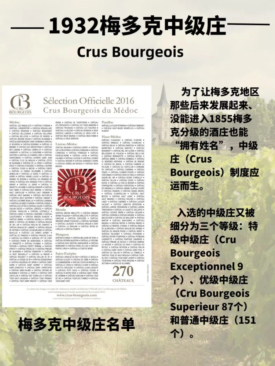 ⭐️由于1855分级制度基本固定,许多新兴的优秀酒庄无法列级,建立新的分级制度的呼声越来越高。1932年,波尔多商会和吉伦特农业联盟(Gironde Chamber of Agriculture)共同起草了一个中级庄分级名单,中级庄制度应运而生。