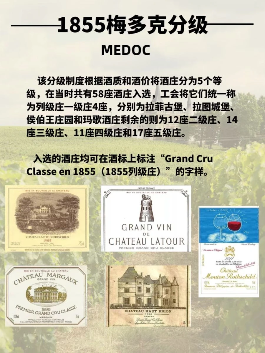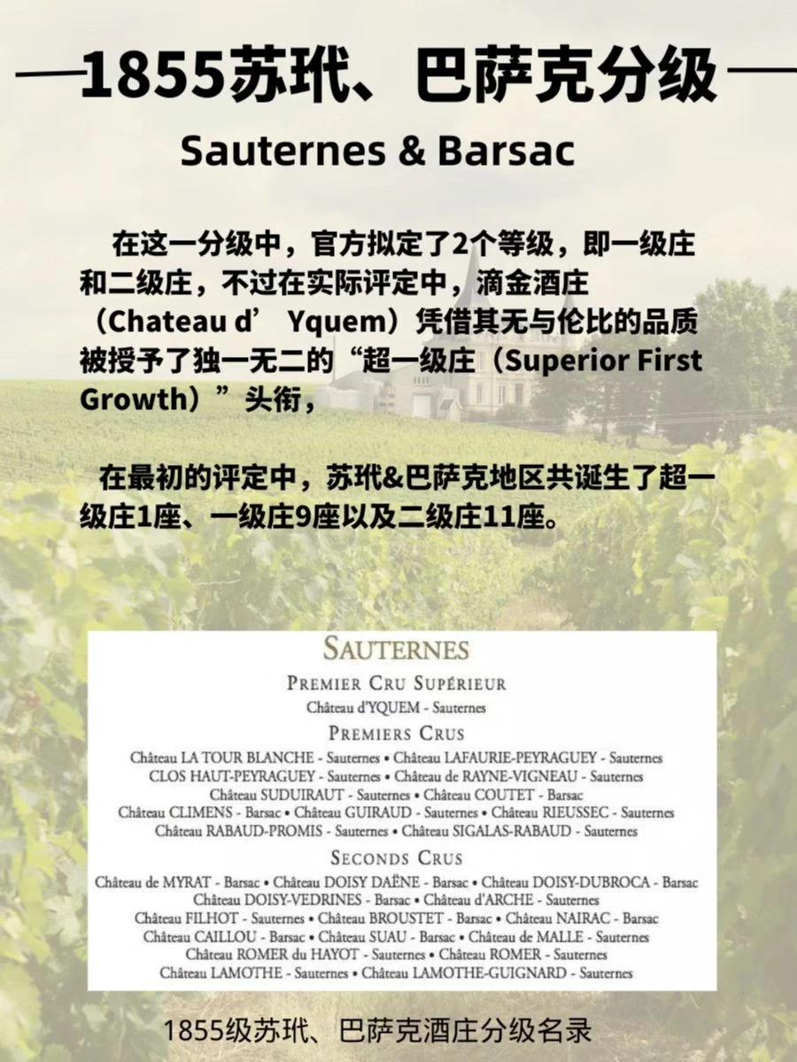 ⭐️1855分级制度包括两部分:针对红葡萄酒的1855梅多克分级制度和针对甜白葡萄酒的1855年苏玳和巴萨克分级制度。
