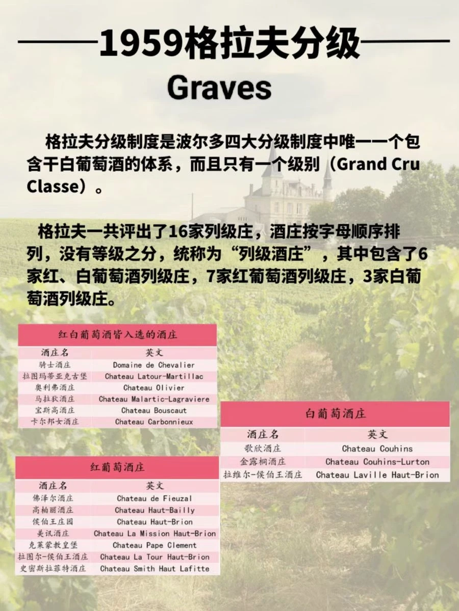 ⭐️1953年,应格拉夫酒业公会请求,法国AOC的官方管理机构——法定产区管理局INAO开始拟定一份综合评定酒庄、风土、酿造及陈年能力的,能代表格拉夫葡萄酒最高水准的酒庄名单。1959年定稿,16家酒庄进入分级,之后再未进行过复审更改。