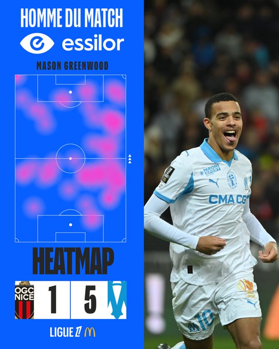 虎扑11月21日讯法甲第13轮,马赛客场5-1尼斯,格林伍德梅开二度。