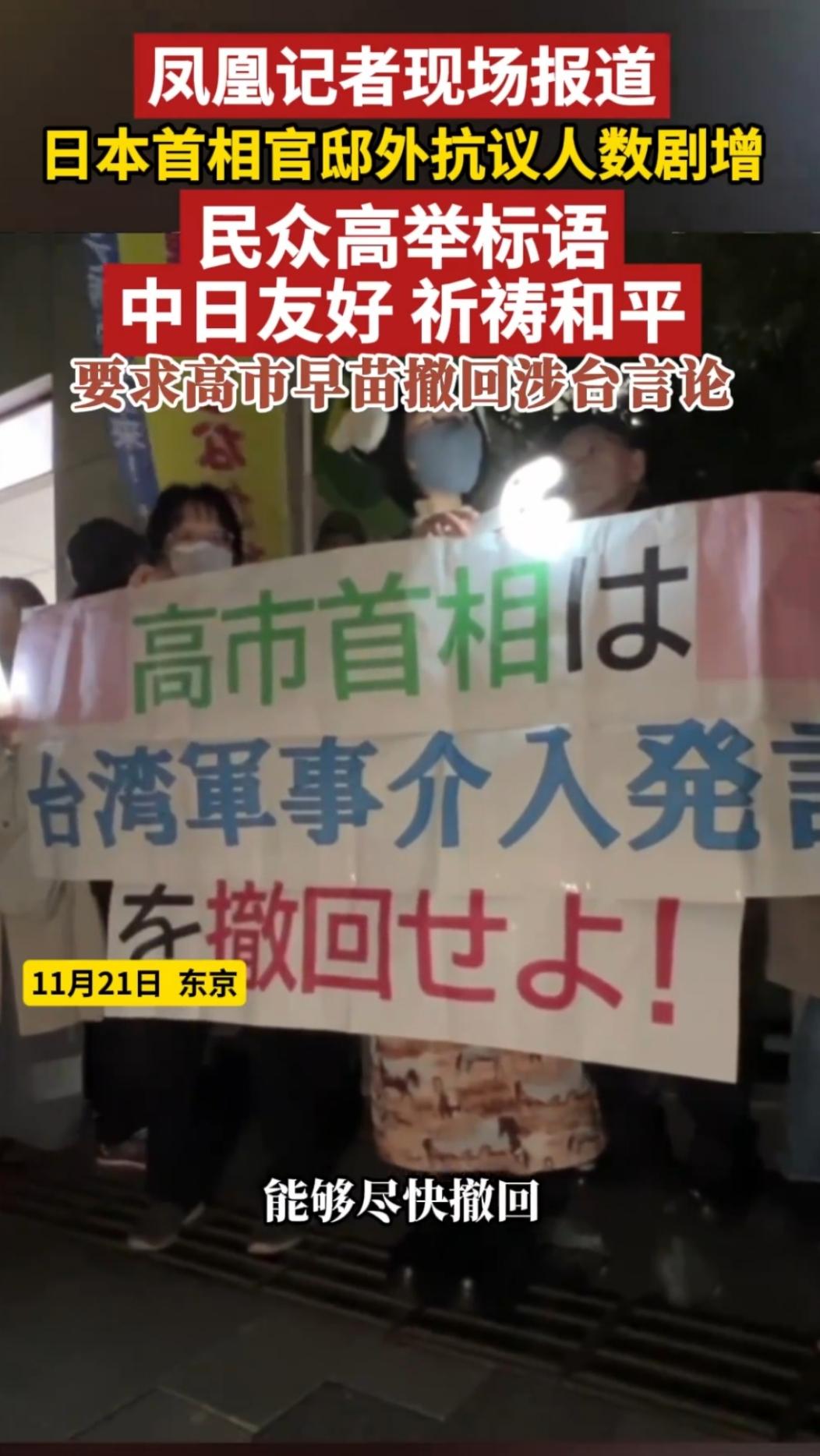 高市早苗还能撑多久 当地时间11月21日晚,1700余名日本民众在东京首相官邸外集会,抗议首相高市早苗涉台言论。 对于不当言论,高市早苗虽有松口,但仍未收回其言论。目前中国已经拒收日本出口的海产品,同时国人也开始退票不去日本旅游。日本经济必然受到一定影响,幸好我国还没使用必杀技限制稀土出口日本,还没有清理钓鱼岛上的乱七八糟的东西。 这个嘴硬的高市还能撑多久,要等我国更严厉的手段吗?