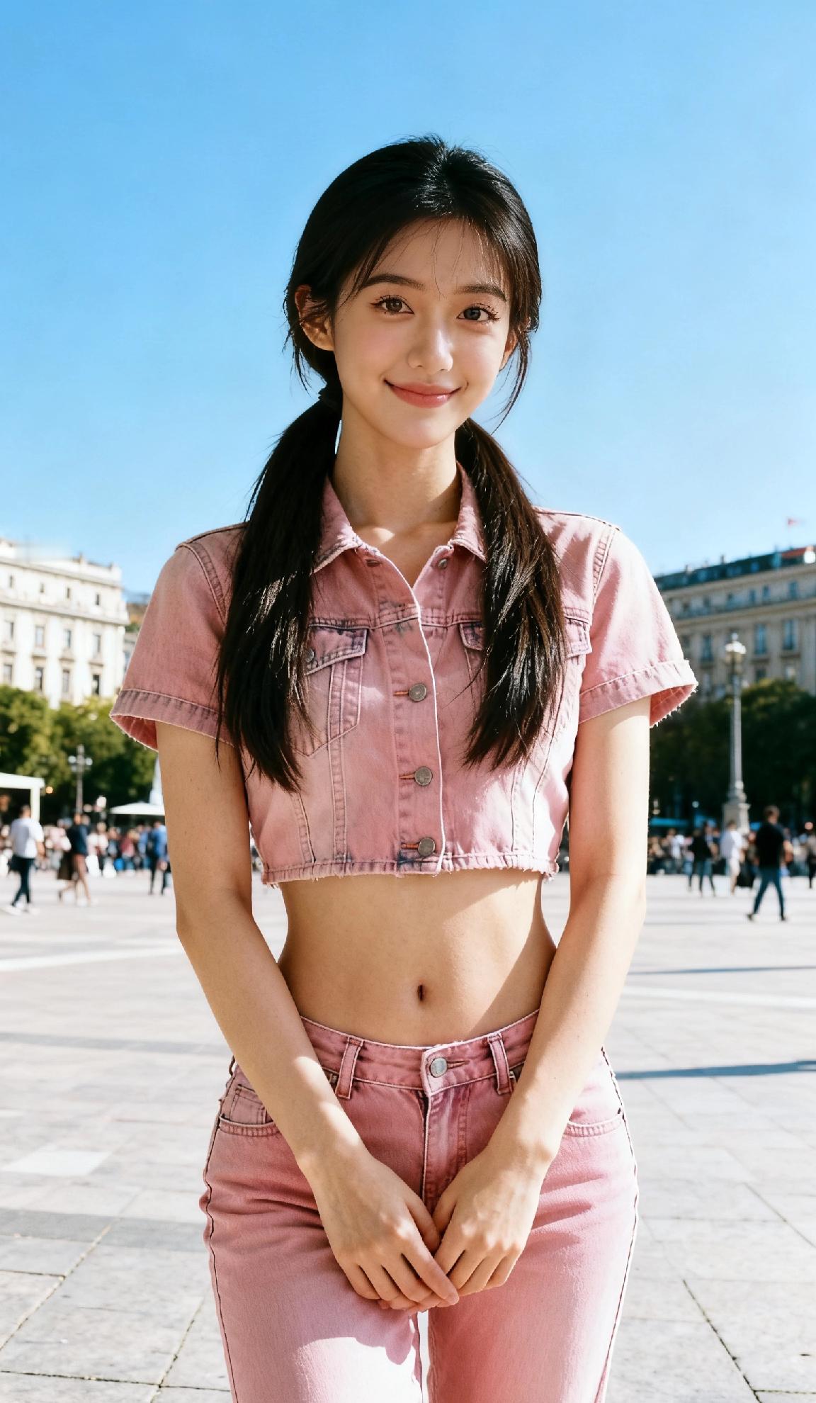 街拍美女,身着粉色牛仔服,完美身材被勾勒而出,尽显清纯可爱。