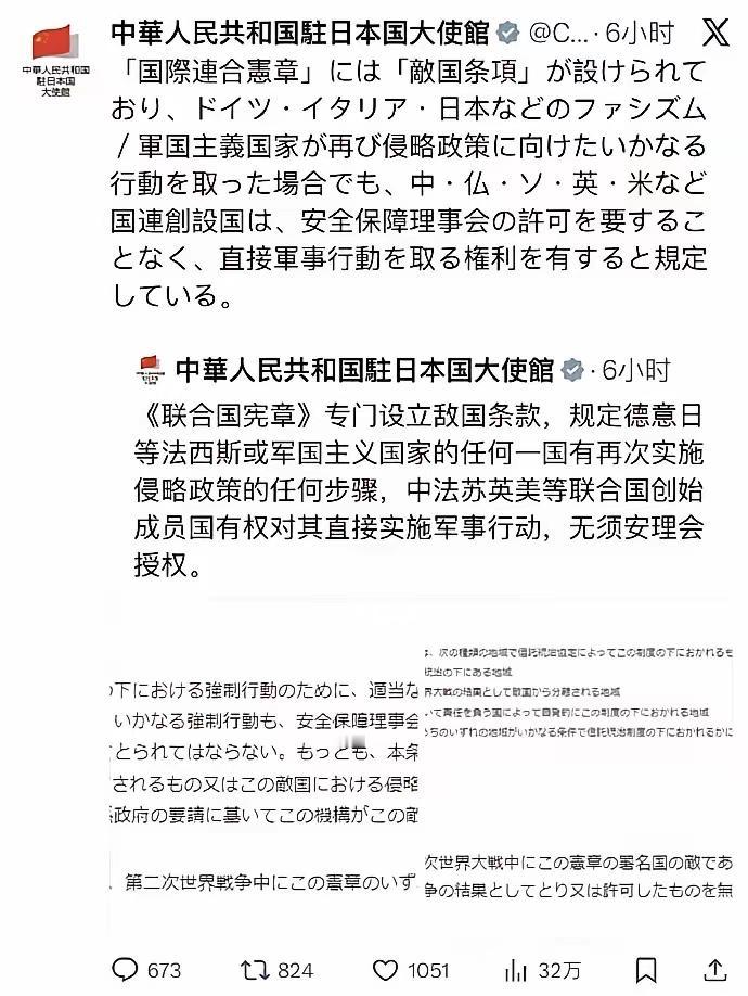 2025年11月21日下午,中国驻日大使馆在国际社交媒体平台X上用中日双语发帖,明确中国有权军事打击实施侵略政策的日本。这一基于《联合国宪章》敌国条款的声明,瞬间引爆国内外舆论。 这份声明并非空穴来风,其核心依据是《联合国宪章》第53条、第77条和第107条构成的“敌国条款”。该条款是二战后反法西斯同盟专为德国、日本等轴心国设立的约束性规则,明确只要这些国家出现侵略图谋或步骤,中法苏英美等创始成员国可直接采取军事行动,无需安理会授权。从1945年宪章制定至今,这一条款虽被日本多次要求删除,但因需五常一致同意始终未得逞,成为悬在军国主义头上的达摩克利斯之剑。 声明的发布有着清晰的现实背景。2025年1月,日本政府批准8.7万亿日元防卫预算,较上年增长9.4%,重点投向高超声速导弹研发、F-35战斗机采购等“反击能力”建设。更具挑衅性的是,11月7日日本首相高市早苗在众议院公然宣称,“台湾有事”可能构成日本的“存亡危机事态”,暗示可行使集体自卫权,这与1931年日本以“满洲存亡”为借口发动九一八事变的逻辑如出一辙。 中国的反应始终保持克制且层层递进。11月10日起,外交部发言人毛宁多次严正批评高市早苗的言论,国防部发言人蒋斌大校11月14日更是明确表态,日方若武力介入台海,必将“碰得头破血流”。11月19日,中国全面暂停日本水产品进口,而11月21日的使馆声明,正是从国际法层面亮出的终极底线。 值得关注的是,日本国内并非一片盲从。11月8日,前首相鸠山由纪夫率先发声,批评高市早苗的涉台言论是干涉中国内政,会将日本拖入冲突。随后前首相野田佳彦、石破茂等纷纷跟进,公明党、社民党党首也要求收回相关言论,可见日本国内对军国主义复苏的担忧并非个例。 国际社会同样看得清楚。美国《欧亚评论》撰文指出,高市早苗的强硬姿态背后,是日本右翼势力推动的军事扩张,这与战后和平原则背道而驰。而中俄2025年5月发布的联合声明,早已明确反对任何复活军国主义的图谋,两国在维护战后国际秩序上形成有力呼应。 在国内,网友的情绪既振奋又理性。南京网友的留言道出了历史伤痛,上海网友的分析紧扣法律依据,广东网友的观点呼应了波茨坦公告的规定。大家明白,声明的核心不是挑起冲突,而是用国际法捍卫和平,防止历史悲剧重演。 从发展走向来看,日本若继续推进军事扩张和涉台挑衅,必将面临更多反制。中国的声明既是警告,也是维护地区稳定的责任担当。随着东盟等周边国家对日本军国主义的警惕提升,国际社会形成的约束合力将不断增强。 历史和法律都站在正义一边,任何试图挑战战后秩序、复活军国主义的行为,终将付出应有的代价。和平从来不是妥协换来的,而是靠坚定的立场和足够的实力守护的。 文章描述过程、图片都来源于网络,涉及版权或者人物侵权问题,或有事件存疑部分,联系后即刻删除或作出更改