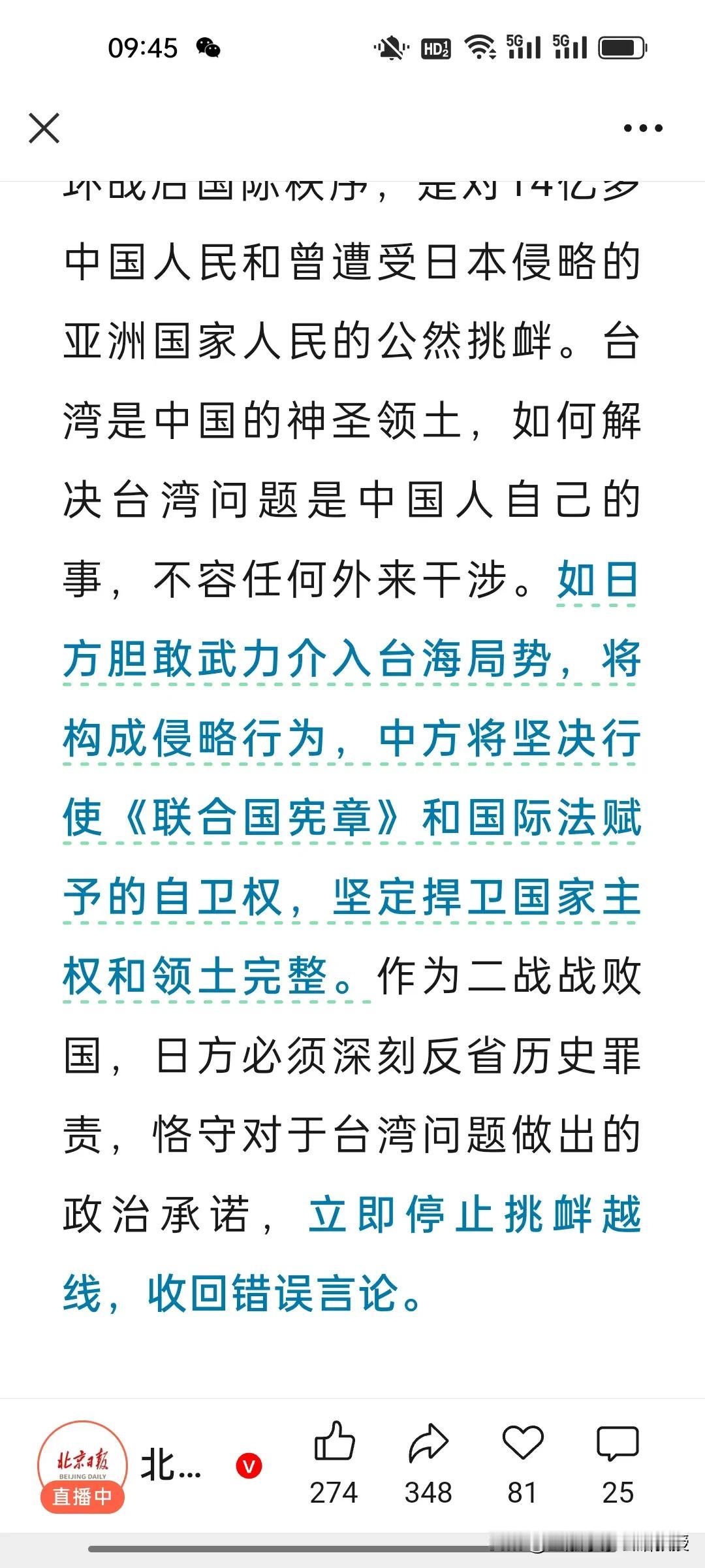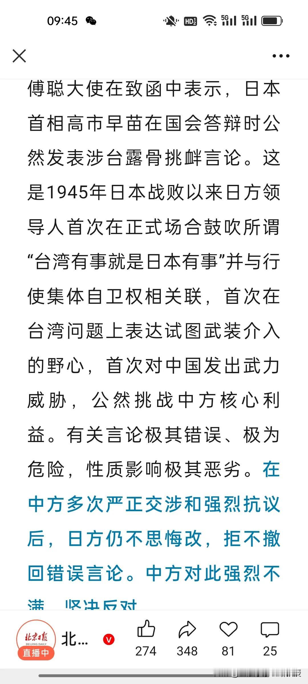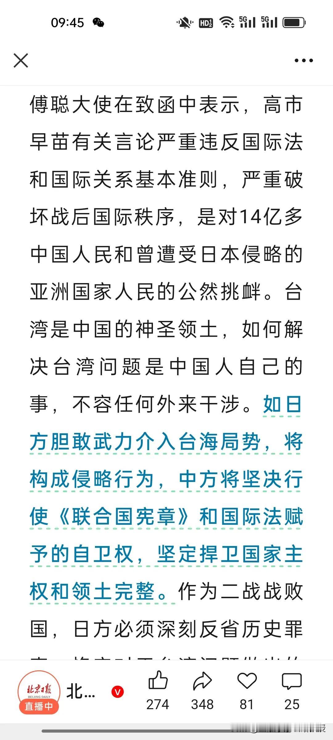 我国做事情一向是先礼后兵,已经做到了仁至义尽。看下图,中国已经致函联合国,该函作为联合国正式文件,向全体会员国散发。函中也讲得很明确,如果日本坚持不悔改,坚持武力介入台海问题,中国将坚决执行自卫权,我们已经都在联合国提前打好招呼了,接下来中国怎么做完全取决于日本的表现。高市早苗昨天还面对日媒镜头笑得很开心,这种挑衅的笑容,换不来安全,只会换来中国坚决的反制。