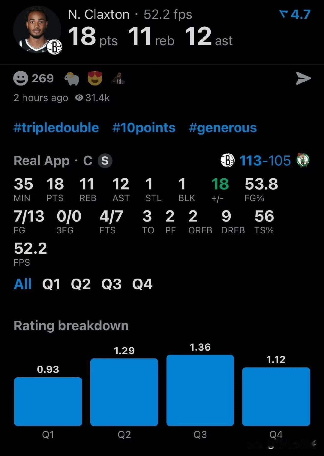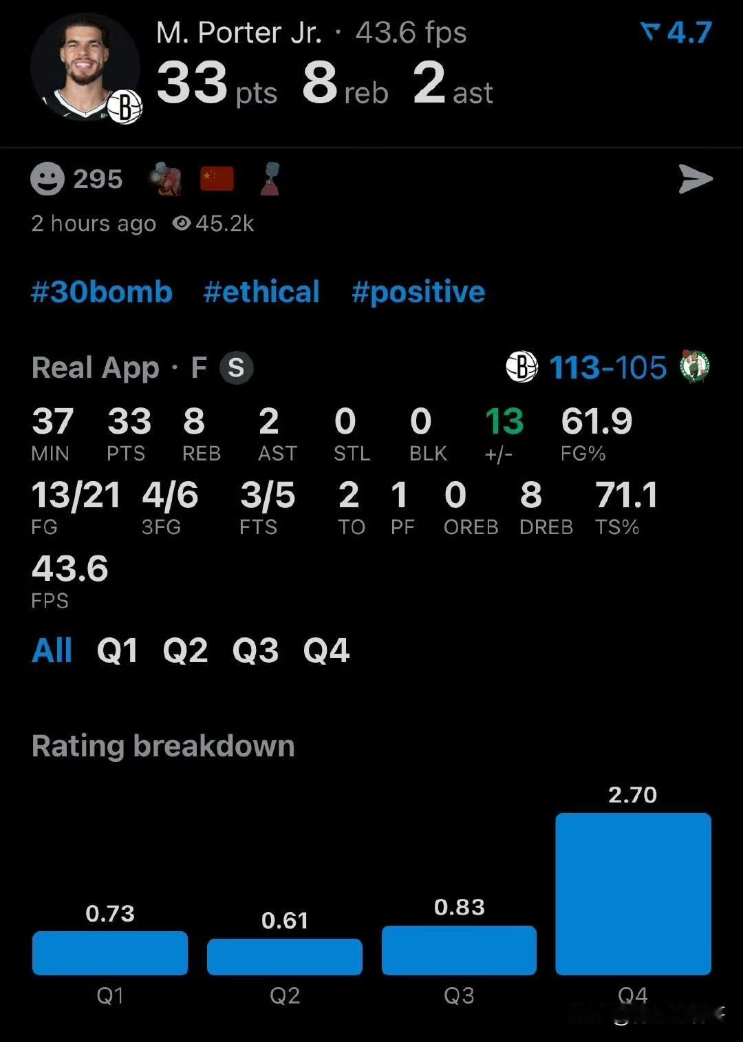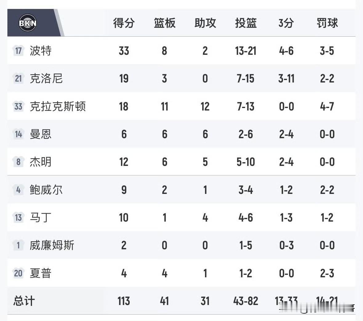 赛季第三胜!!!小波特33+8,赵四三双,篮网客场胜凯尔特人! 在刚刚结束的一场比赛中,篮网客场113-105拿下凯尔特人,在杯赛这么重要的时刻,而且收获了他们赛季的第三胜,篮网球员非常开心。 篮网方面: 小波特独揽33分,21中13也很高效,不知道掘金后悔没有;克拉克斯顿拿下三双18分11篮板12助攻,表现非常出色; 凯尔特人方面: 杰伦-布朗26+8,怀特也只有6分,三分7中1,白帝也有点失去了之前的风采。 大家是不是都忘记杰伦-布朗可是总冠军最有价值球员了,但是没了獭兔后,凯尔特人已经像彻底换了一支球队了。 篮网从东部垫底的三兄弟脱颖而出,步行者也是拿到第二胜追上了篮网,而今天他们再次拿到胜利,又领先那哥俩了! 篮网 凯尔特人