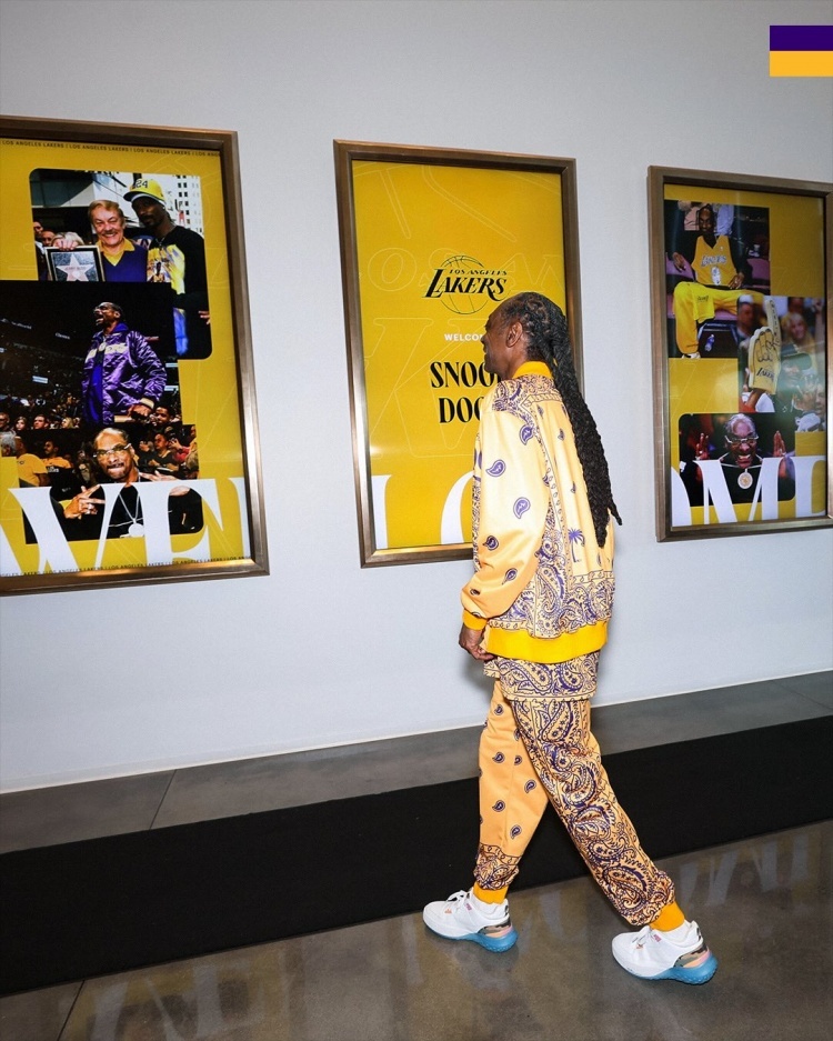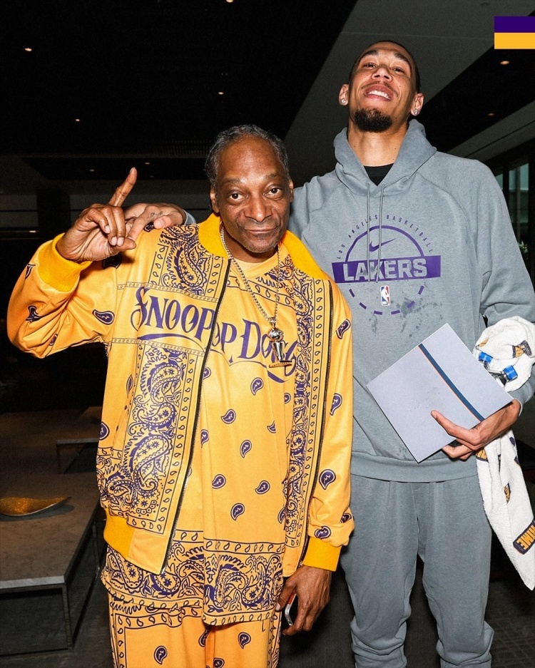 支持主队!湖人官推晒出了著名歌手Snoop Dogg造访球队训练馆的组图。