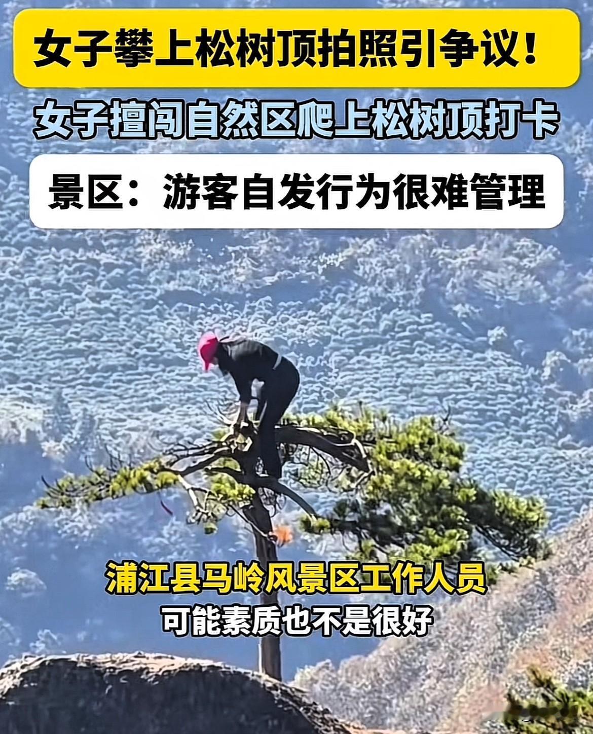 真是吃饱撑的!浙江金华,女子居然在景区内爬上松树顶“拍照打卡”,景区人员无奈表示:“禁止爬上去,但是很难管理!”网友出主意:“罚款10万,你看看还有敢上去吗?” 原来这里是一个网红打卡地,尽管边上有标识提醒,禁止上树拍照,但是很多游客很早就上去了,后续景区工作人员会加围挡。 我就纳闷了,这么漂亮的树欣赏不好吗?非要上去嘚瑟什么。如果从树上掉下来,摔伤了,谁来负这个责任呢?会不会找景区赔偿? 归根到底,一些人素质太差,对于这种人,还是要有法律规则制约,还是要提高素养,省的出去丢人! 关于女子景区爬树拍照这个事,你有什么看法? (信息来源:都市现场)