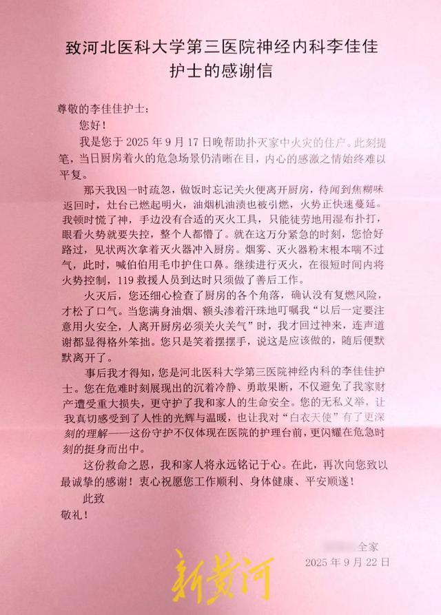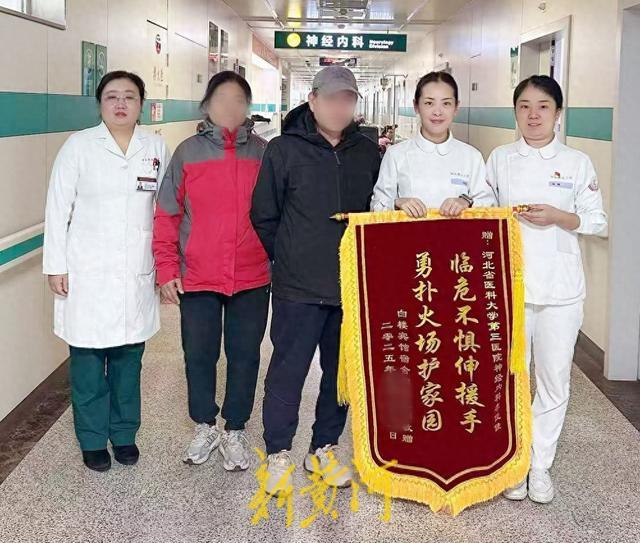 近日,韩大爷和其爱人专程来到河北医科大学第三医院,将一面锦旗和一封感谢信交到神经内科一病区护士李佳佳手中,言语中满是感激。这份质朴而真挚的感谢,生动诠释了“白衣天使”的深刻内涵——她们的守护从不局限于医院病房,更延伸至生活中每一个挺身而出的危急时刻。