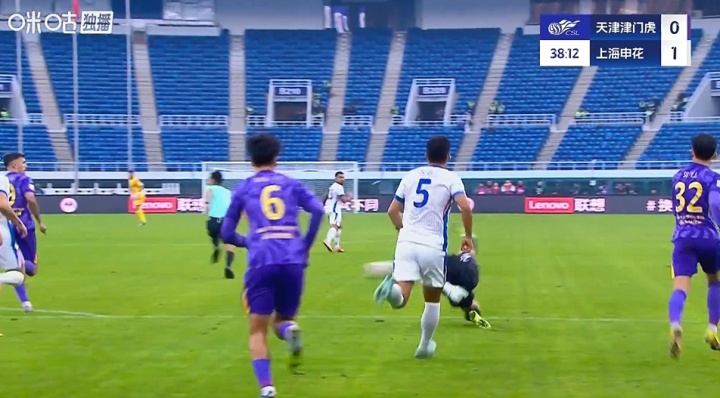 第38分钟,闫炳良开大脚失误,特谢拉得球直接吊门稍稍打高