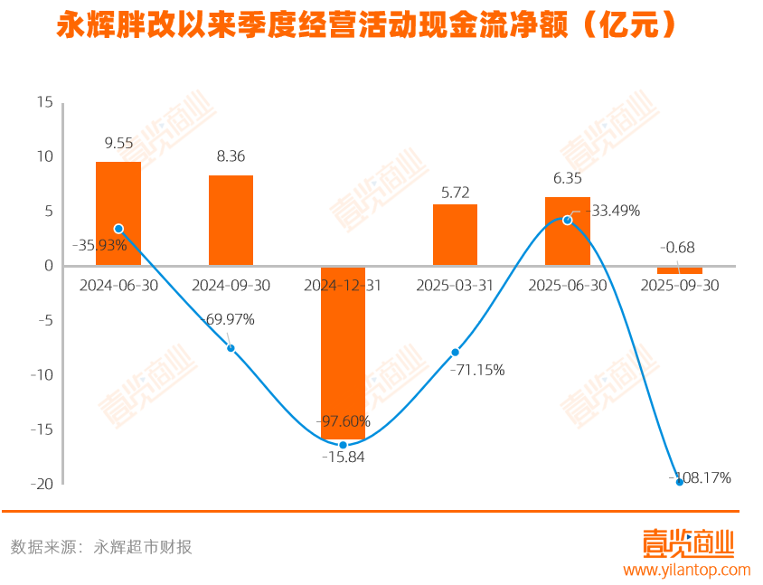 但胖改却未能带来应有的成效。季度报显示,永辉近6个季度的经营活动现金流净额波动剧烈,2025年第三季度其经营活动产生的现金流量净额由上年同期的8.36亿元转为-0.68亿元,意味着永辉的入不敷出,也表明主营业务的“造血”功能极不稳定。