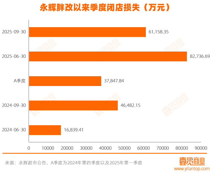 与之相伴的是高昂的闭店成本。根据永辉今年以来发布的董事会的会议决议公告,闭店损失从2024年第二季度的1.68亿上升至2025年第三季度的6.12亿,根据公布的闭店数测算,关闭一家门店的成本从2024年第二季度的374.21万元上升至2025年第三季度的588.06万元,涨幅达57%。