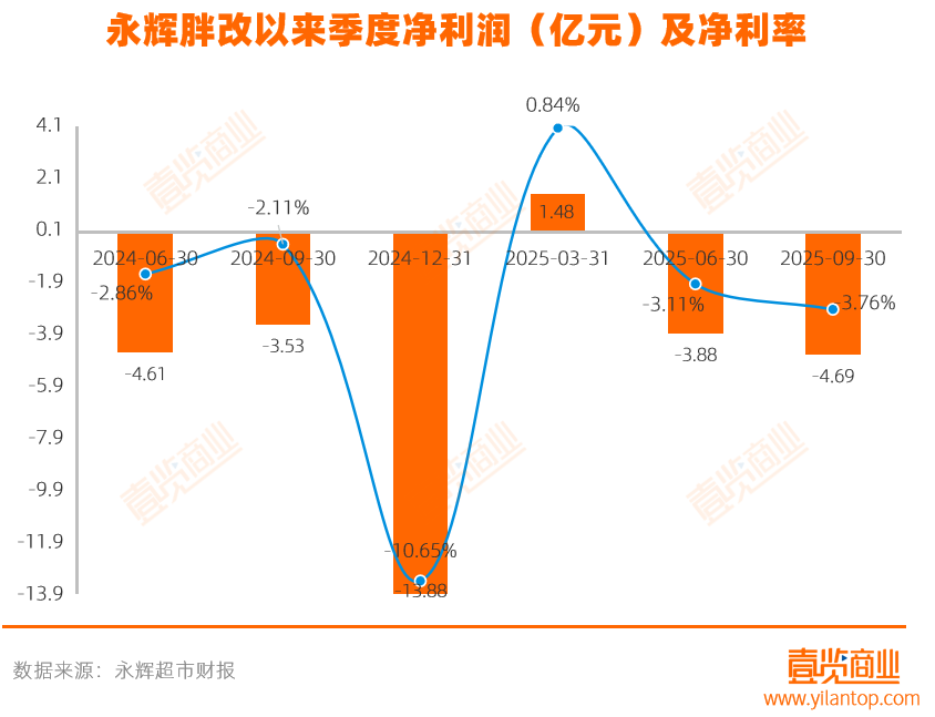 于是我们看到,除了2025年第一季度的归属于上市公司股东的净利润为正,胖改以来的另外5个季度,永辉每个季度都亏损3亿以上的金额,2024年第四季度亏损超13亿人民币,净利率在-10.65%——0.84%之间徘徊。