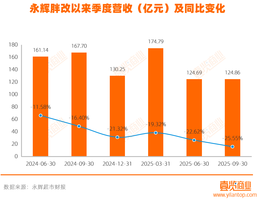 股东撤离的背后,是永辉持续恶化的经营状况。2025年前三季度,永辉实现营收424亿元,同比下降22.21%,亏损7亿元。2021年至2024年,永辉共计录得归母净亏损95.01亿元,加上2025年前三季度的亏损额,不到五年亏超百亿。