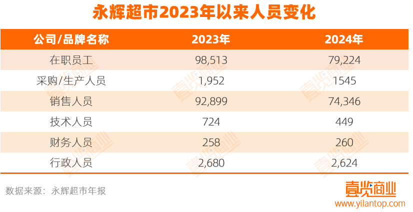 更重要的是,这些表面涨薪的背后,是永辉员工总数的急剧减少。从2023年末到2024年末,永辉在职员工总数从98513人减少至79224人,裁员比例达19.58%。其中技术人员从724人减少至449人,降幅达38%。