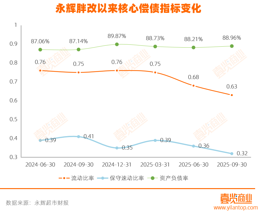 现金储备减少,短期偿债能力显著恶化。最近6个季度,永辉的流动比率始终低于0.8,且在2025年6月后进一步下滑至0.63。保守速动比率长期低于0.45,2025年9月仅为0.32。