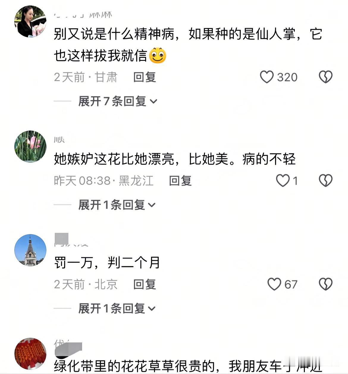 这是受了什么刺激!山东青岛,女子不知道怎么了,疯狂的将绿化带里面的绿植扔到马路上,最后扔的满地都是。网友:“一定要抓住这个女人,狠狠的罚!” 据目击者反应,环卫工人已经将路面清理干净,只是可惜了这些绿植了。 我认为,对于女子这种行为,属于故意破坏绿化带,不管什么原因,都不值得原谅。 不应该给清洁工人找事,必须让她清理干净,必须让她照价赔偿,成年人做事不考虑后果吗? 对于这种毫无公德心的人,必须严惩,人到任何时候都要控制好自己的情绪,不能为所欲为,大家觉得呢? (信息来源:AHTV第一时间)